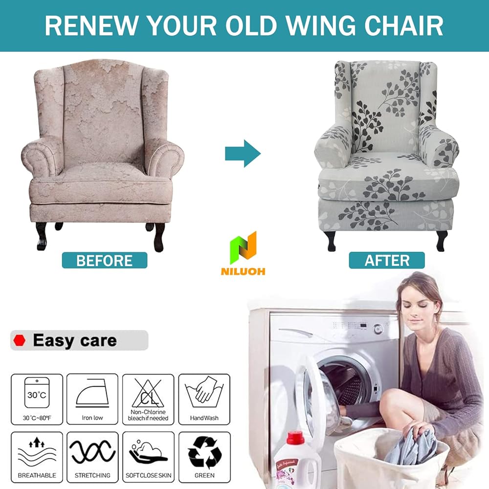 Easy Care & Install: Machine washable for easy care and maintenance, wash separately in cold water at gentle cycle, using mild laundry detergent, do not bleach and iron. This 2 piece wing chair slipcover install easily and quickly in mere minutes, soft to touch, update your decor with the wing chair cover.