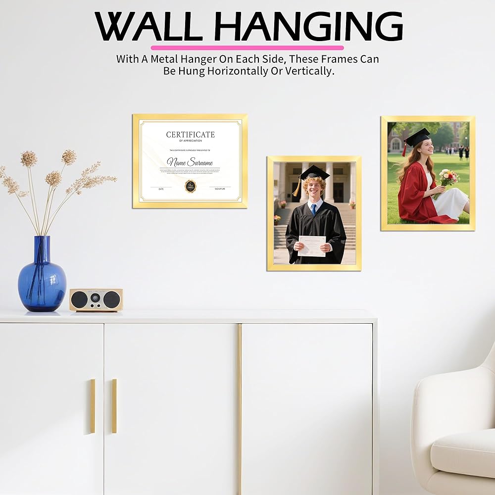 VERTICAL & HORIZONTAL WALL DISPLAY: Designed with two strong brackets on the back, these certificate frames can be effortlessly hung on the wall, allowing you to display your documents horizontally or vertically with ease. This feature allows you to create stunning gallery displays that highlight your favourite images in the orientation that best suits your style and space.