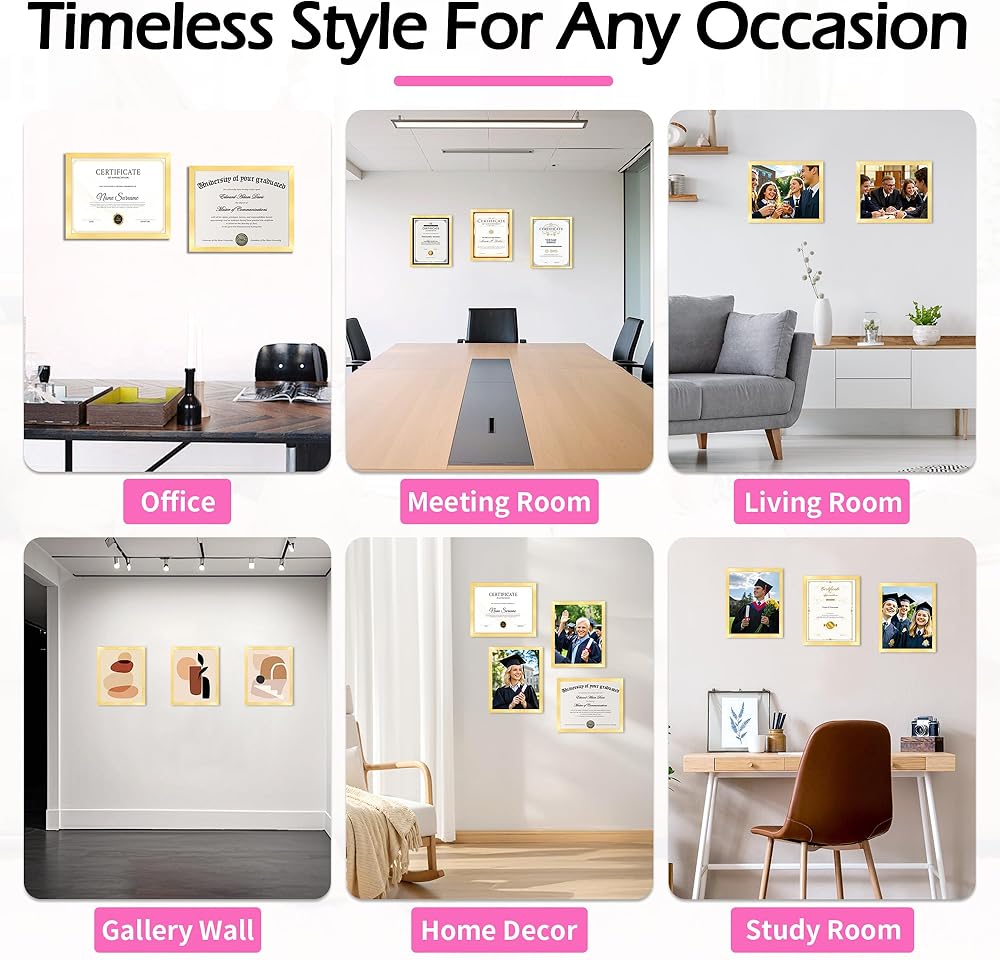8.5X11 PICTURE FRAME: Designed to fit 8.5 x 11-inch certificates, diplomas, photos, prints, awards, artwork, and degrees, these black picture frames offer a sleek, universally compatible display solution. The minimalist design complements any document, from academic achievements to professional certifications or cherished memories.