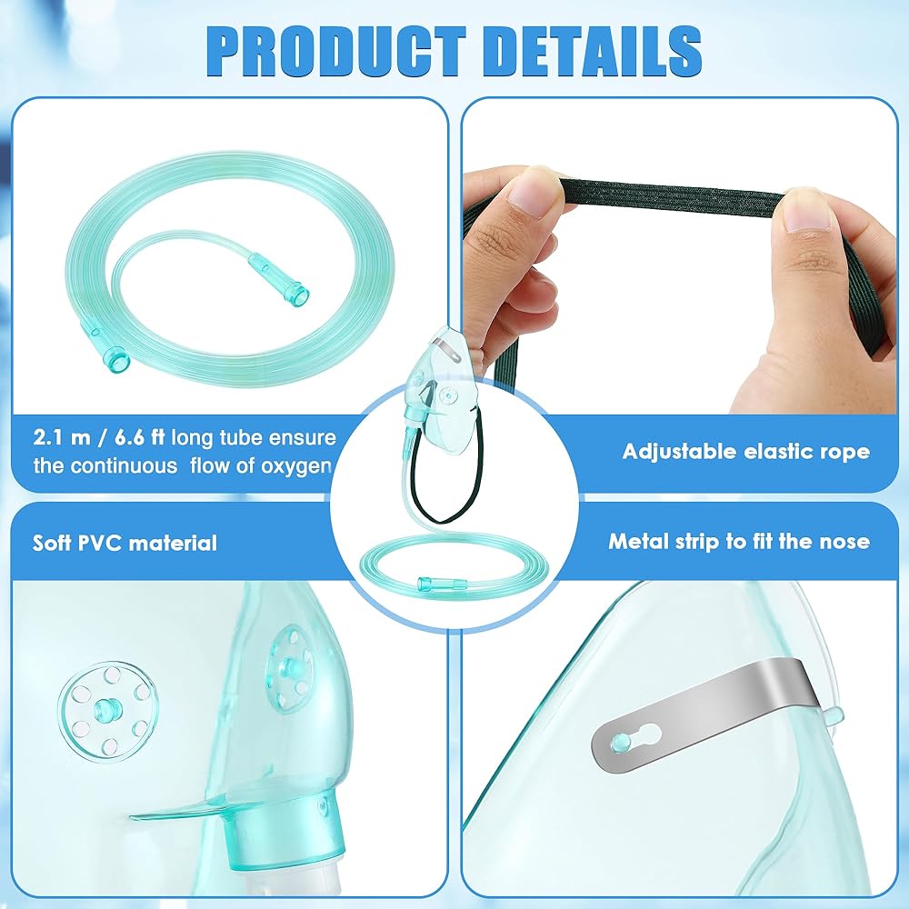 Thoughtful Design: The oxygen mask for adult comes with an adjustable elastic headband that suits different head sizes, ensuring a safe, comfortable fit without slipping. It is further enhanced by a malleable nose clip that allows for precise adjustment of the nose profile, proper sealing to ensure optimal oxygen delivery, and a 7 foot anti kinking tube that allows for barrier free movement and consistent oxygen flow; This feature also helps prevent oxygen leaks, maximizing treatment efficiency