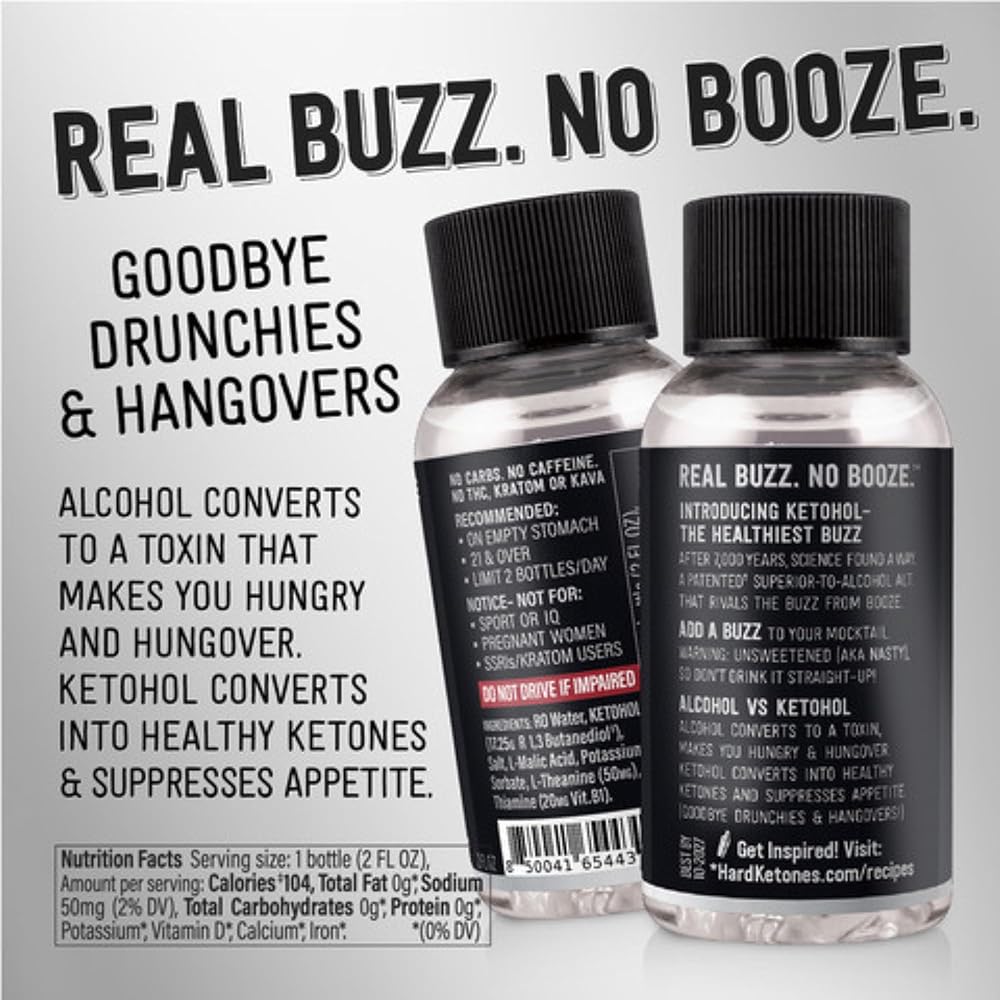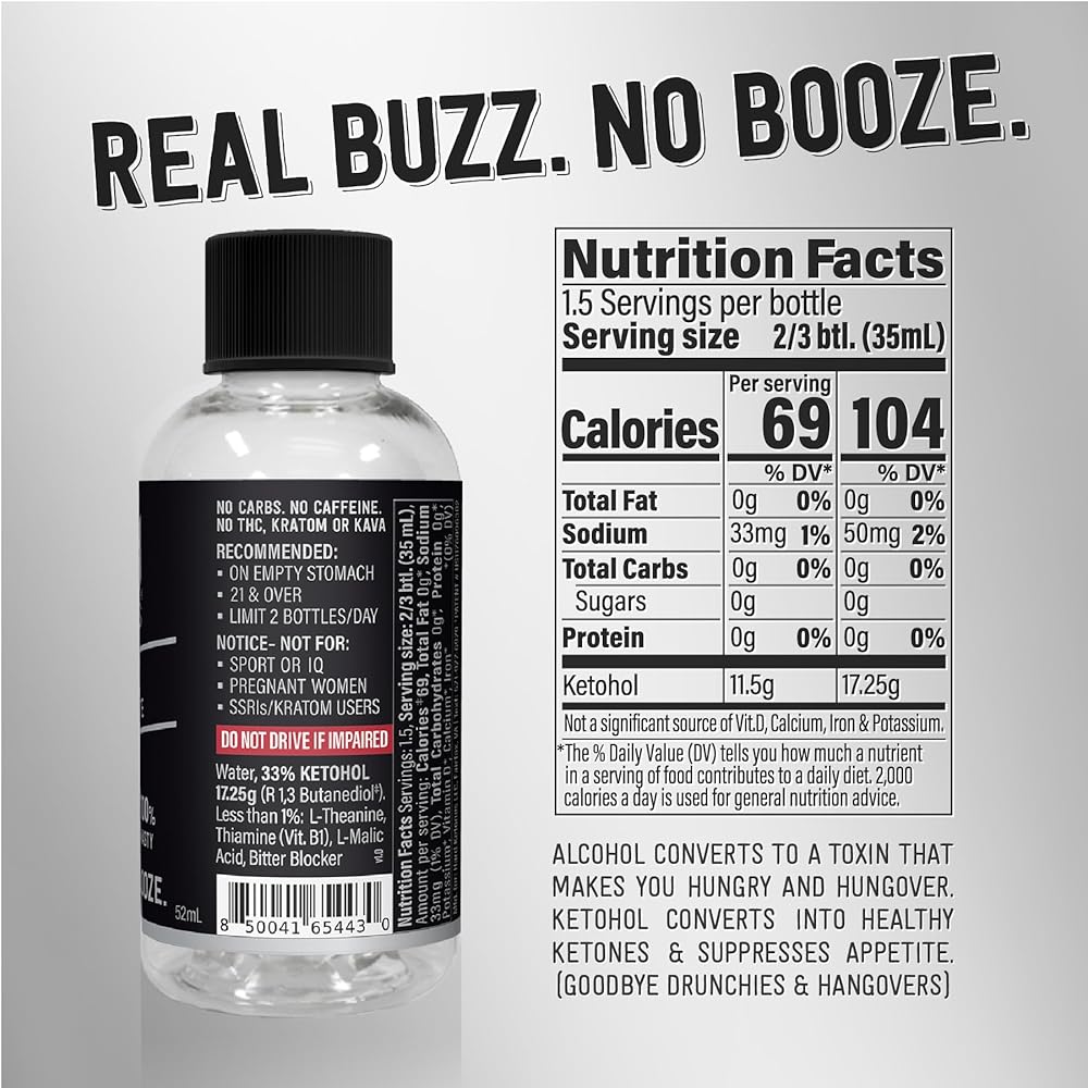 Introducing Ketohol: An alcohol alternative with a real buzz, without the booze. Unwind tonight and still wakeup fresh tomorrow! 15g (4.5%) Ketohol, 0 carbs, 90 calories, 0.0% alcohol, 0 sugar, and 0 caffeine.