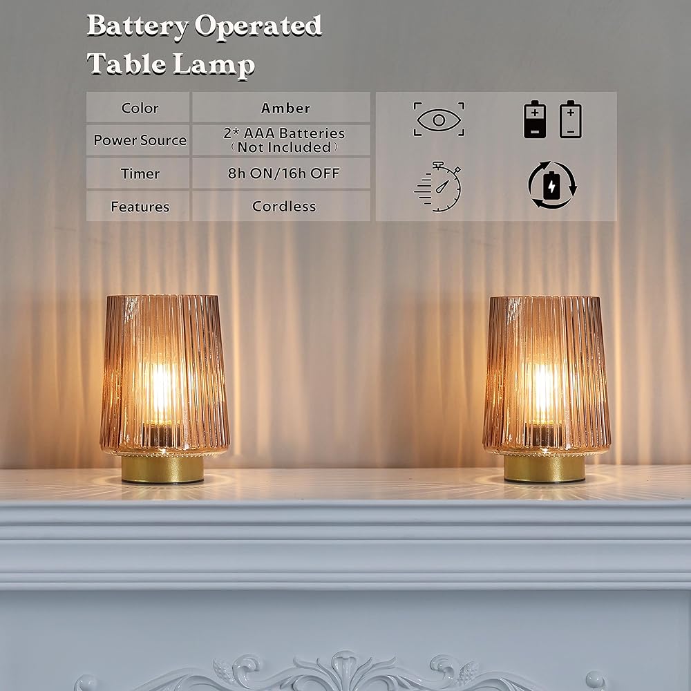 Battery Operated Lamp with Timer, Set of 2 Small Cozy Table Lamp Decorative Ambient Glass Lamp for Bedside & Home Decor, Aesthetic Cordless Battery Powered Accent Lamp for Living Room Shelf, Amber