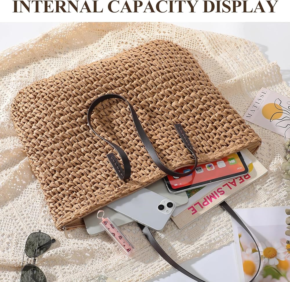 LARGE SIZE/ LARGE CAPACITY - 16.5×7×15.7 inches. This straw beach bag is large enough to hold clothing, towels, sunglasses, cosmetics, books, cellphone, purses, food, etc. One inner pocket is convenient for storing cards, cash, and other small items.