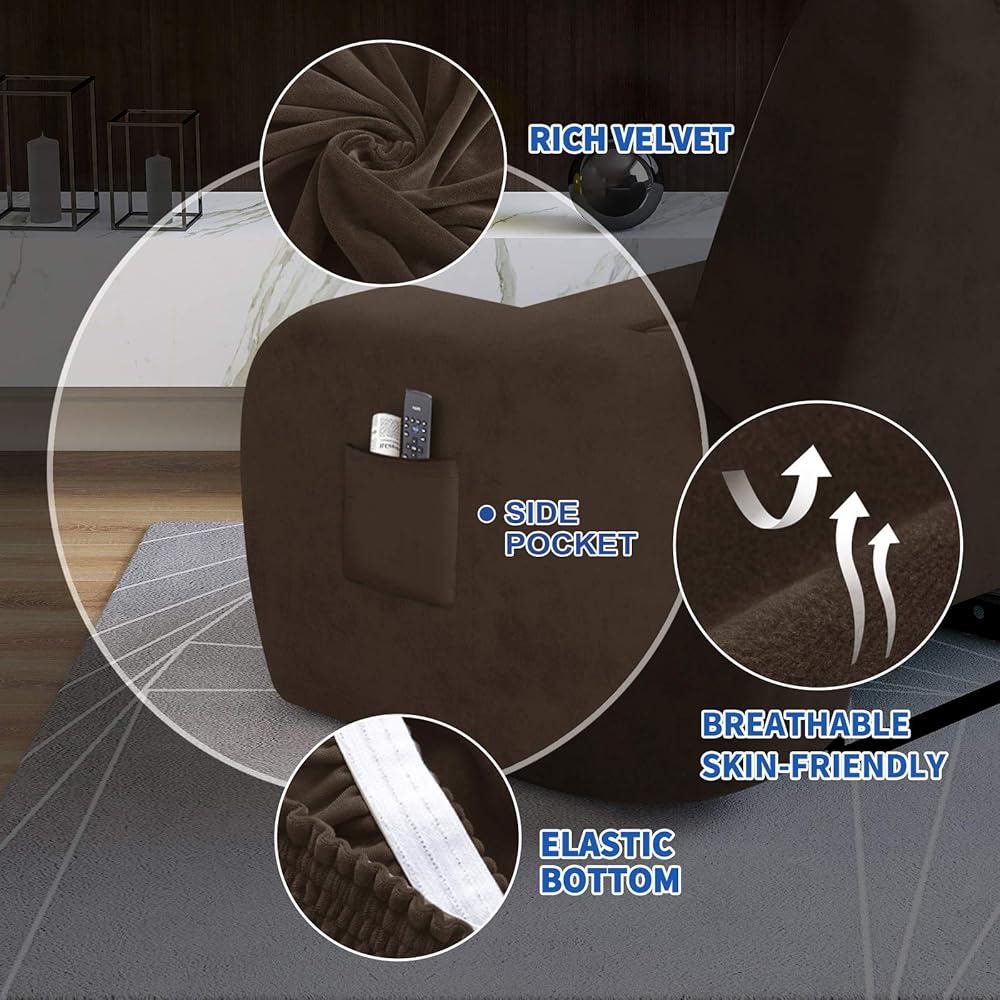 4-PIECE DESIGN: MAXIJIN velvet 4-piece recliner cover contains 1 piece back cover, 2 pieces arm covers and 1 piece seat cover. Individual design would be more fitted than normal 1-piece recliner chair cover, no need constantly tuck or adjust the recliner cover, easy to install and disassmble. There is also a practical pocket design on the side of the recliner slipcover, which allows you to store your mobile phone, books and magazines while sitting on the recliner chair