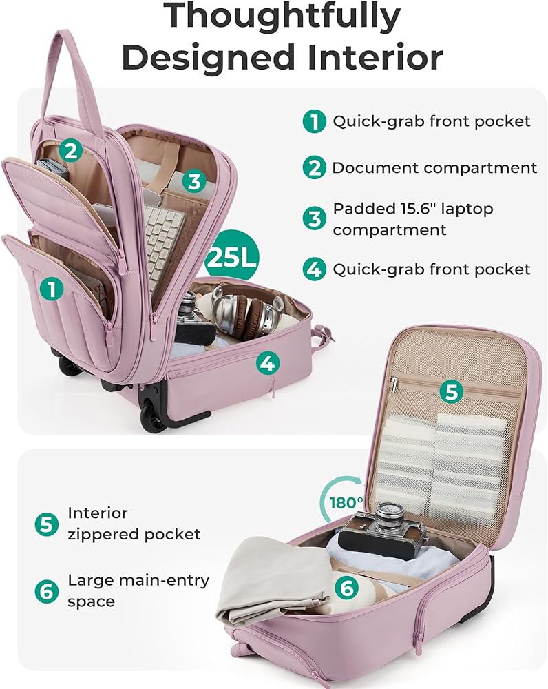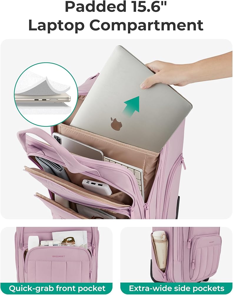 Organized Storage: Effortless organization is achieved with ample storage, internal compartments, and a small zippered pocket for smaller items. The padded laptop compartment fits up to a 15.6-inch laptop. Making it an ideal carry-on for 2-3 day overnight trips.