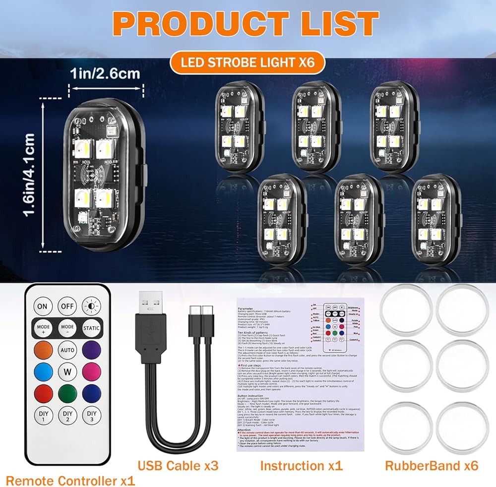 【Package Included & Easily Installation】 - Package included 4 x led strobe lights, 1 x remote control, 8 x rubber rings + 4 x velcro stickers + 1 x 4 in 1 usb cable + 1 x user manual. The two mounting options (velcro or rubber bands) make thesee able to be mounted almost anywhere quickly and easily and also easily remove them for charging