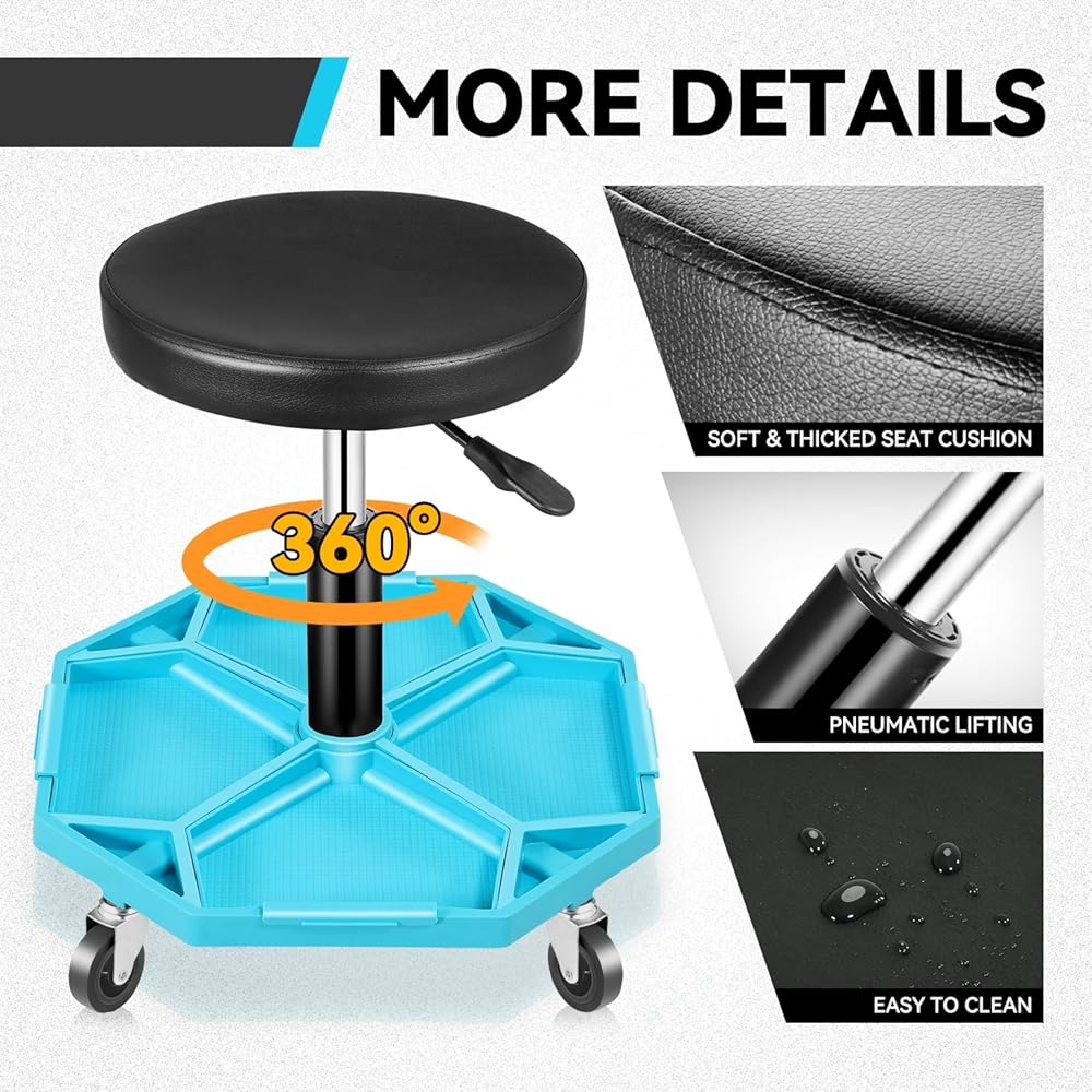 Auto Dynasty Mechanic Stool, Adjustable Rolling Pneumatic Creeper Garage Shop Seat with Tool Tray, 300 LBS Roller Seat for Workshop Auto Repair, Adjustable Height 15.7" to 21", Black/Blue