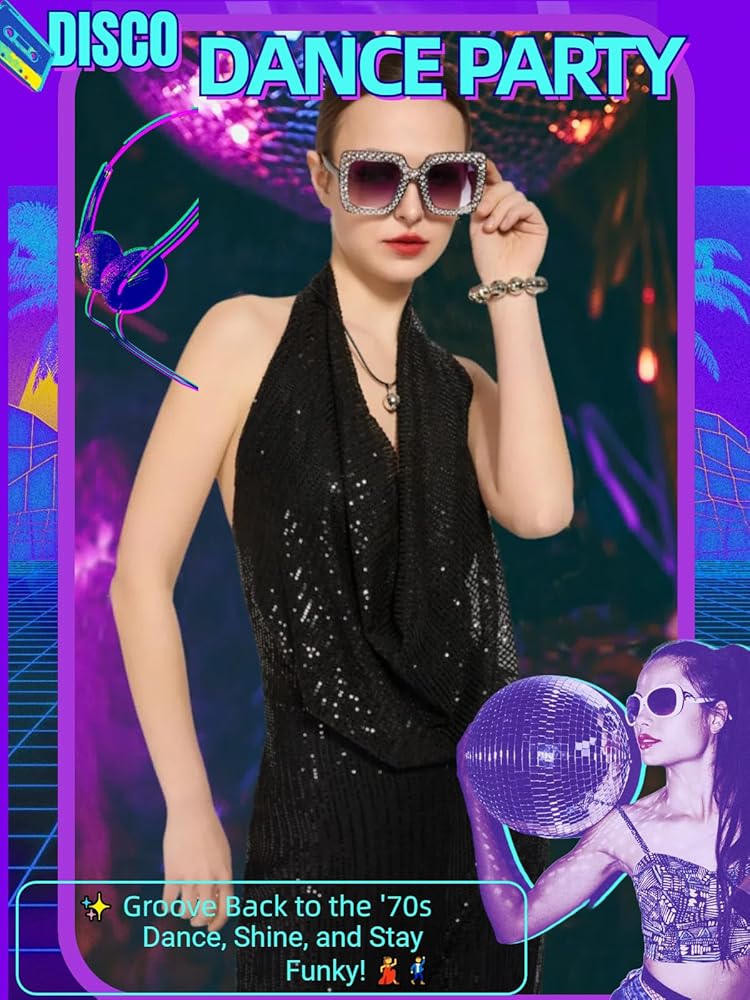 Retro Disco Party Outfit for Women. Package includes disco jumpsuit, disco ball neck lace, bracelet, glasses, earrings. Shine bright in this stunning sequined halter neck backless disco jumpsuit, designed to bring the ultimate disco era vibe to life,capture the vibrant energy of 70s disco fashion