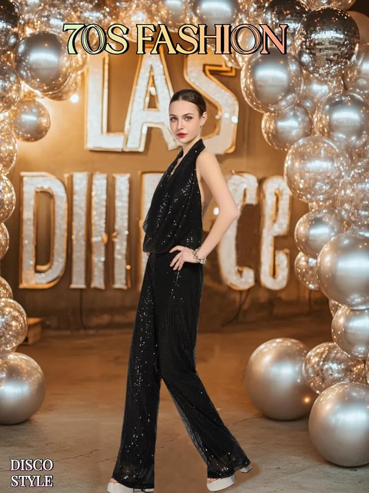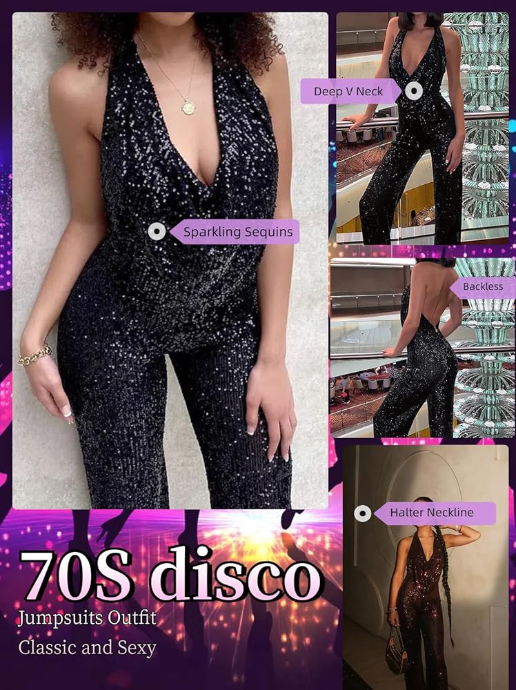 70s Disco Outfit for Woman : Featuring a halter neckline and backless design, this sequin disco jumpsuit delivers a flattering, glamorous 70s look,sculpts a sleek silhouette while embodying iconic retro elegance