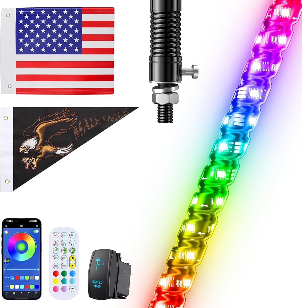 Music synchronized & personalized Flags: The whip lights sync perfectly with your music, bringing your UTV or ATV to life with a rhythmic display that responds to your phone's music or voice. The 6 nylon flags are resistant to dirt, quick to dry, and tough enough to withstand even the harshest off-road conditions, giving your UTV or ATV a personalized touch