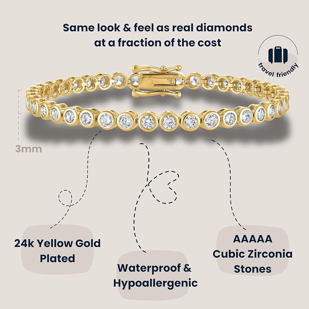 PREMIUM BEZEL SETTING: Each waterproof bracelet is meticulously crafted with 18K white gold or gold plating over hypoallergenic metal with secure bezel settings for maximum stone protection and comfort. The sleek 3mm width and choice of 6.5", 7", or 7.5" lengths ensure a perfect fit.