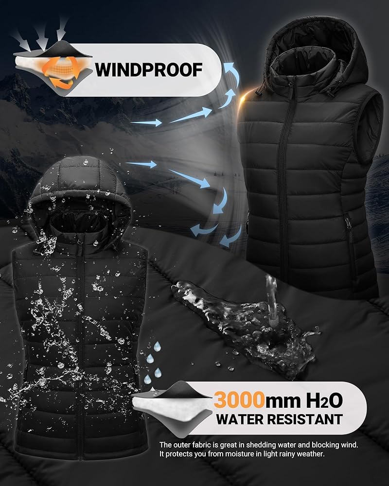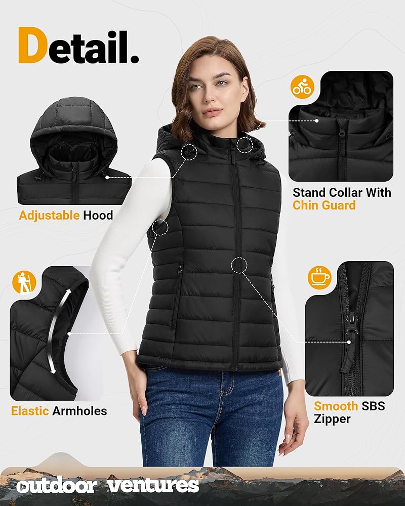Functional Features - The hood with drawstrings can be tightened up to provide extra protection against elements. The elastic hem keeps out the wind and the elastic armholes offer freedom of movement. The zip-up closure with smooth SBS zippers makes this hooded vest easy to wear and match with different outfits. Perfect for casual daily wear, travel and cold weather outdoor sports such as running, hiking, cycling, camping, golf, skiing, etc.