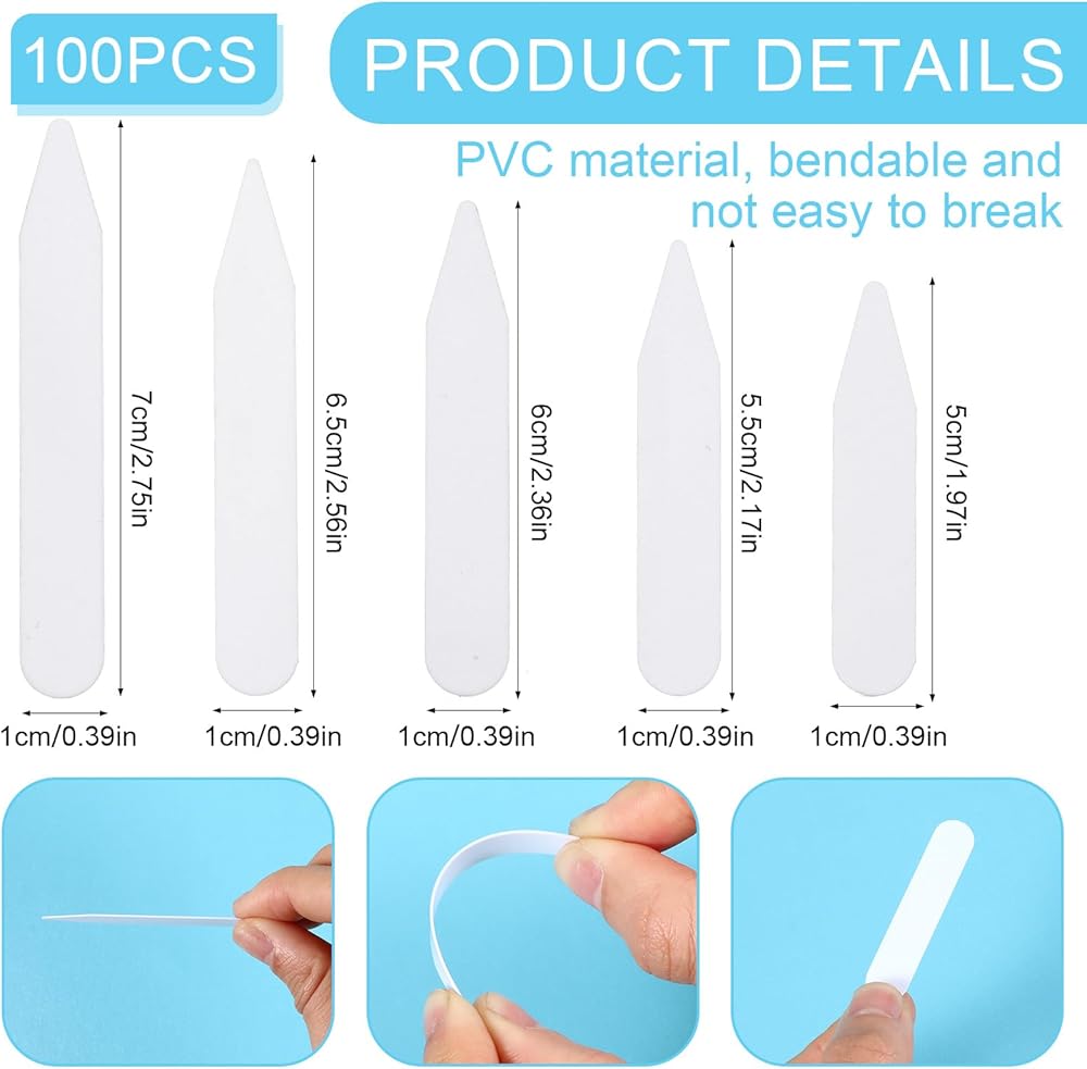 【Packing List】You will receive 100pcs shirt collar stays, 5 different lengths, 5CM/1.97 in, 5.5CM/2.17 in, 6CM/2.36 in, 6.5CM/2.56 in, 7CM/2.75 in. 1cm/0.39 in width, 20pcs of each length collar shirt insert to meet your different needs