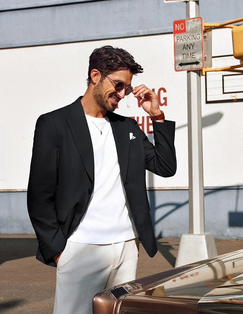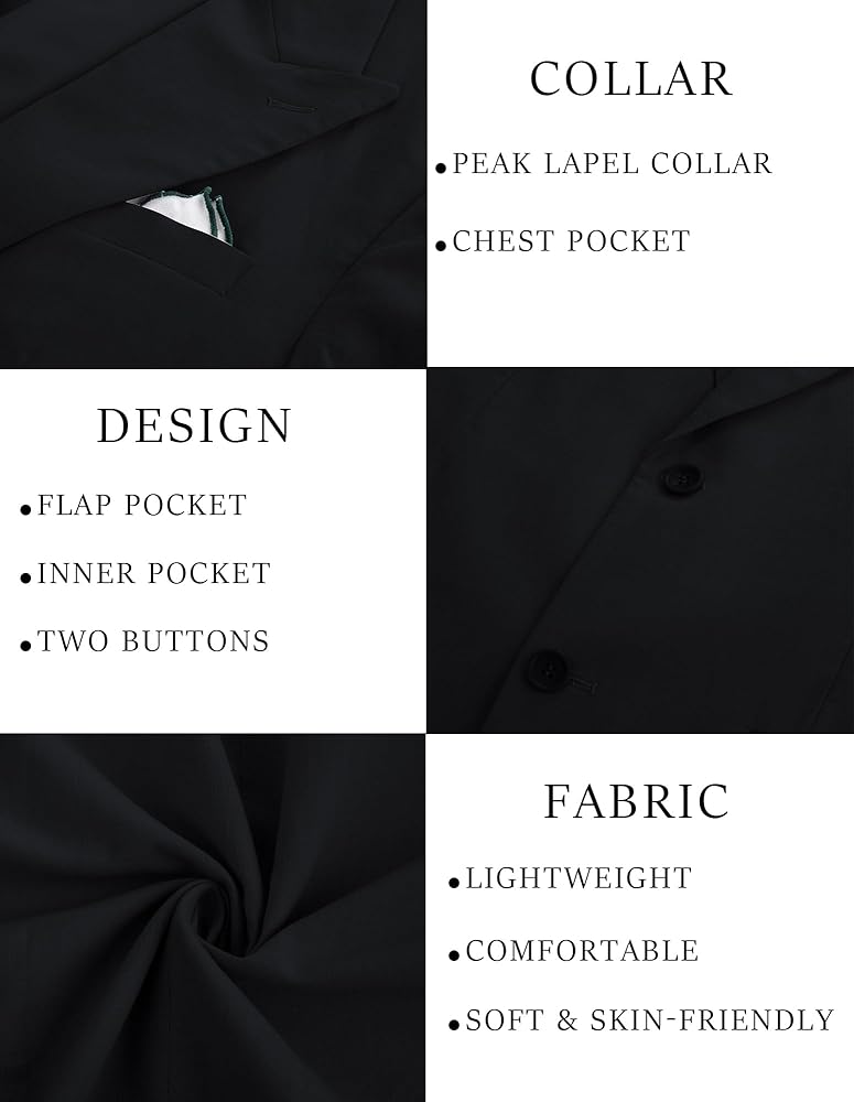 Unique Design: This men's blazer features a classic two-button design with an Italian-style peak lapel, enhancing your confident demeanor and fashion sense. The fabric is lightweight yet lined, ensuring the jacket does not appear cheap due to its thinness. It includes one chest pocket, two flap pockets, and an inner pocket for convenient storage of personal items