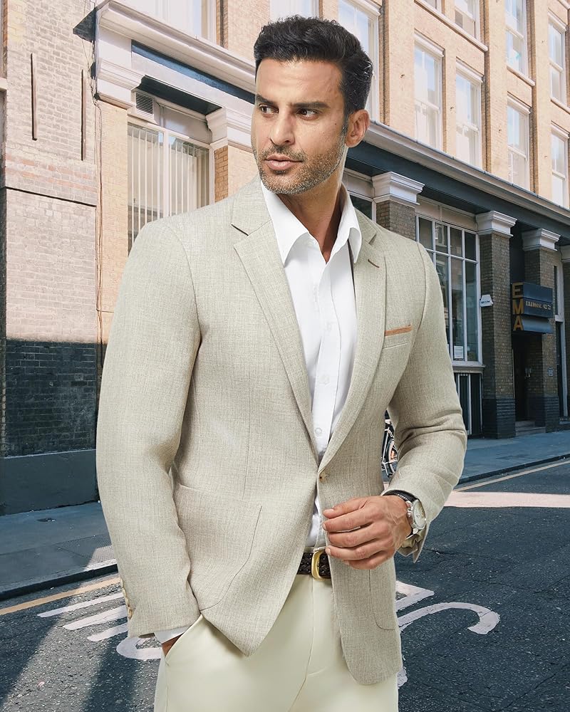 Collocation:Mens linen blazer can be paired with t-shirts or linen shirts, jeans or khakis to create a casual or old money look; paired with a formal shirt and trousers, it is more refined and capable without a tie