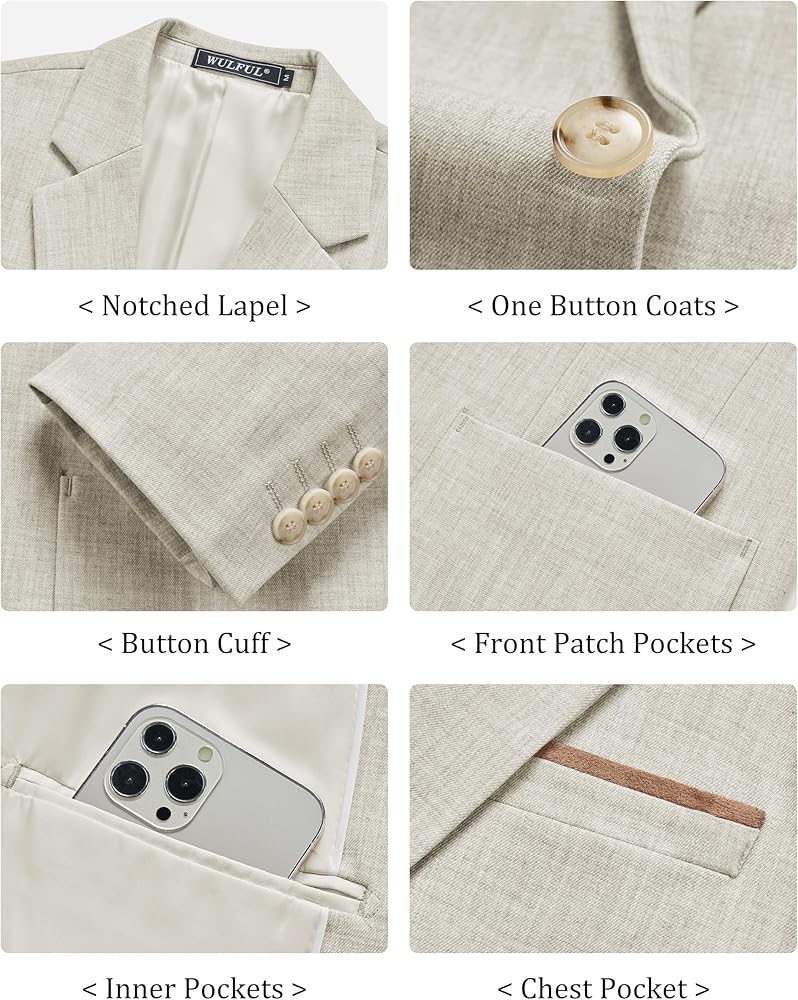 Mens Casual Sport Coat,men lightweight one button suit jackets Features Colors:a notched lapel and a one-button closure, two flap pockets,two inside pockets,and a chest welt pocket for a pocket square Colors:Light Blue,beige,light grey Size:S-3XL available