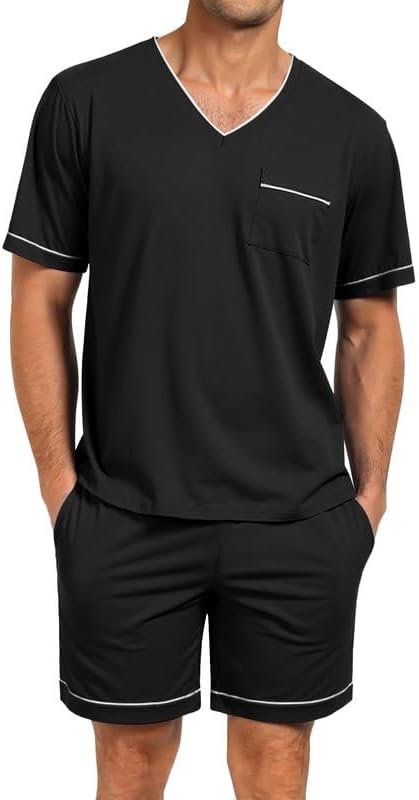 【Design】Men short sleeve pjs set top with v-neck design, chest pocket and features contrasting sitches on the neck, cuffs and hems; bottoms with elastic waistband and pockets.