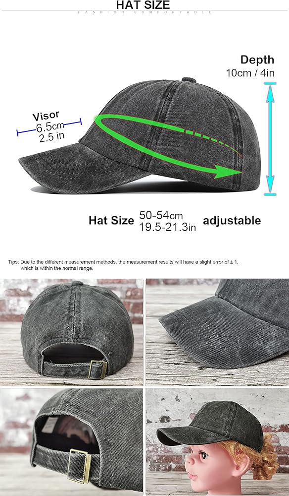 Adjustable: One Size Fits Most. Each cap has an adjustable convenient metal closure and can hide the extra strap. So our kid hats can be adjusted into multiple sizes, fitting most kids with different head sizes and matching kids growing up. Head Circumference: 50 - 54 cm /19.7" - 21.3"; Hat Brim Measures Approx: 6.5 cm / 2.5"; High Approx: 10 cm / 3.94". This unisex baseball cap is perfect for girls and boys