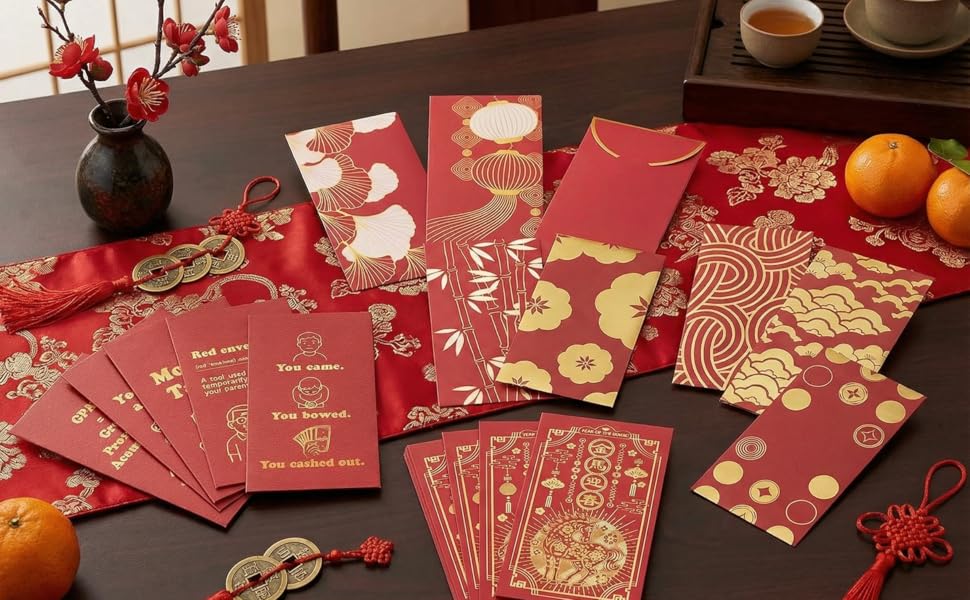 Spread happiness, luck, and prosperity by giving "lucky money" gifts the traditional Chinese way. This pack of 36 Chinese red money envelopes with beautiful auspicious designs and blessings wishes recipients a Happy Chinese New Year this year of the Dragon. Fill these envelopes with money, gold coins, or jewelry and give them with confidence during Chinese New Year, birthdays, weddings, Red Egg and Ginger parties, and other special occasions. Avoid giving sums that include the number 4, which represents death in Chinese. Grab a pack now and shower your blessings on your friends, family, and loved ones!