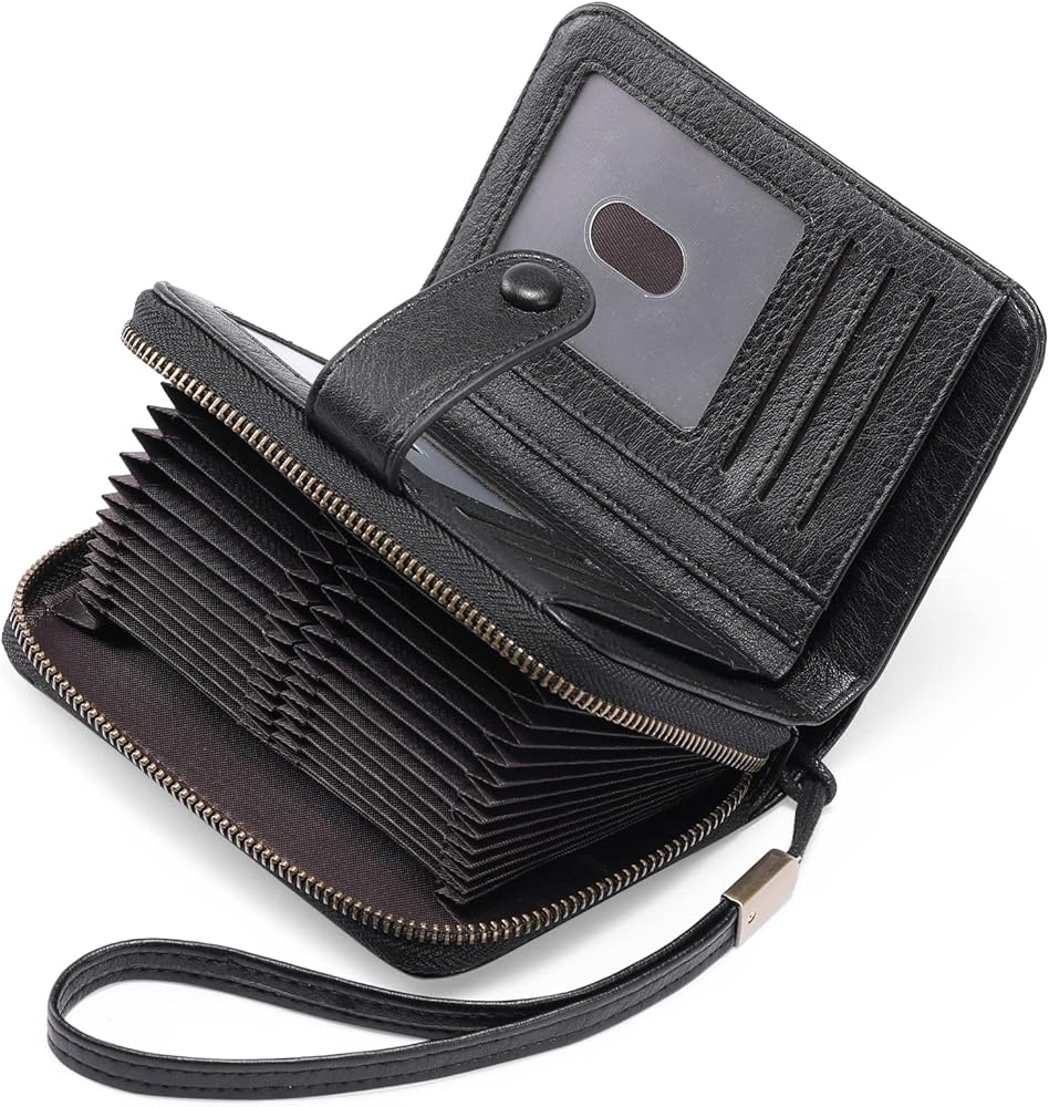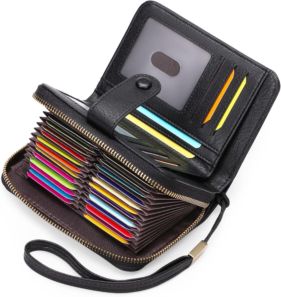 Large Capacity and Well-organized: 24 accordion-style card slots, 8 normal card slots, 2 ID windows with finger holes, and 3 cash slots (2 for folded banknotes), which is enough for holding your daily cards, such as credit cards, debit card, business card, ID card, checks, drivers license, bills, receipts, folded cash and more.