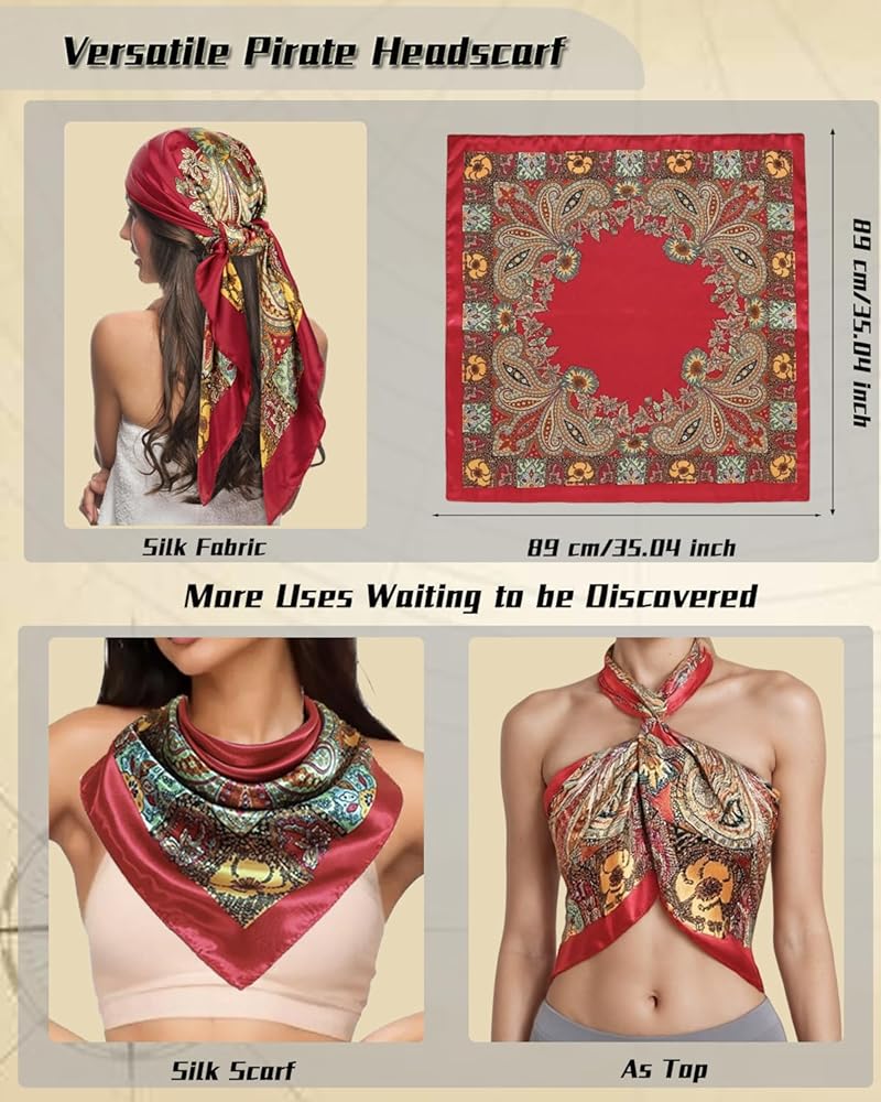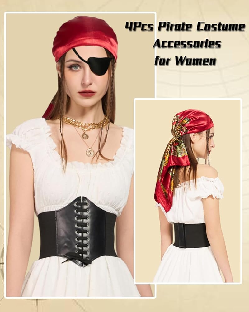 Pirate Accessories for Women Set of 4: pirate costume accessories come with 1 satin square print pirate scarves and hats for women, 1 gold necklace, 1 eye patch, 1 pirate corset ; This complete set of equipment is fully equipped and perfect for meeting most pirate themed event