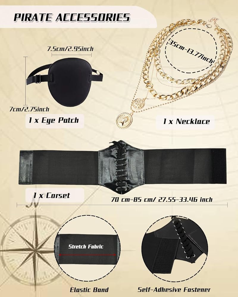 Versatile Pirate Accessories: Among women pirate costume accessories, this set stands out with its versatility. It is not just for role playing but can make for a fun ensemble during Halloween parties, masquerade balls, school stage performances or other costume event. These pirate accessories can also effectively accentuate a pirate costume, making them an essential part of any pirate-themed event