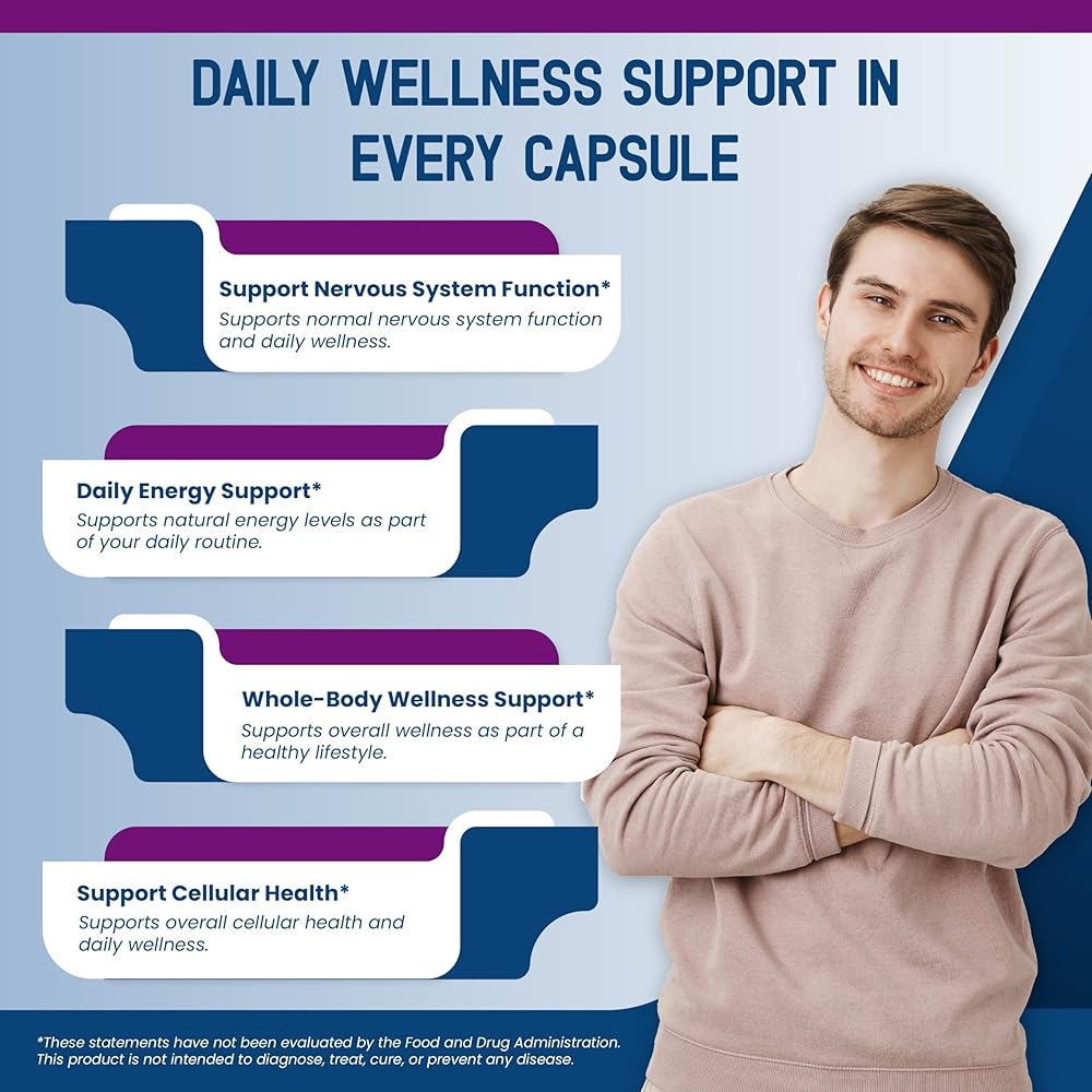 Crafted with Benfotiamine, Alpha-Lipoic Acid, Berberine, our capsules support cellular energy, circulation, and overall cognitive health – essential for those who want to stay sharp, active, and full of life. They help you feel focused, energized, and clear-headed, whether you're at work, exercising, or simply going about your day.