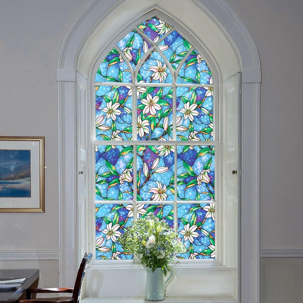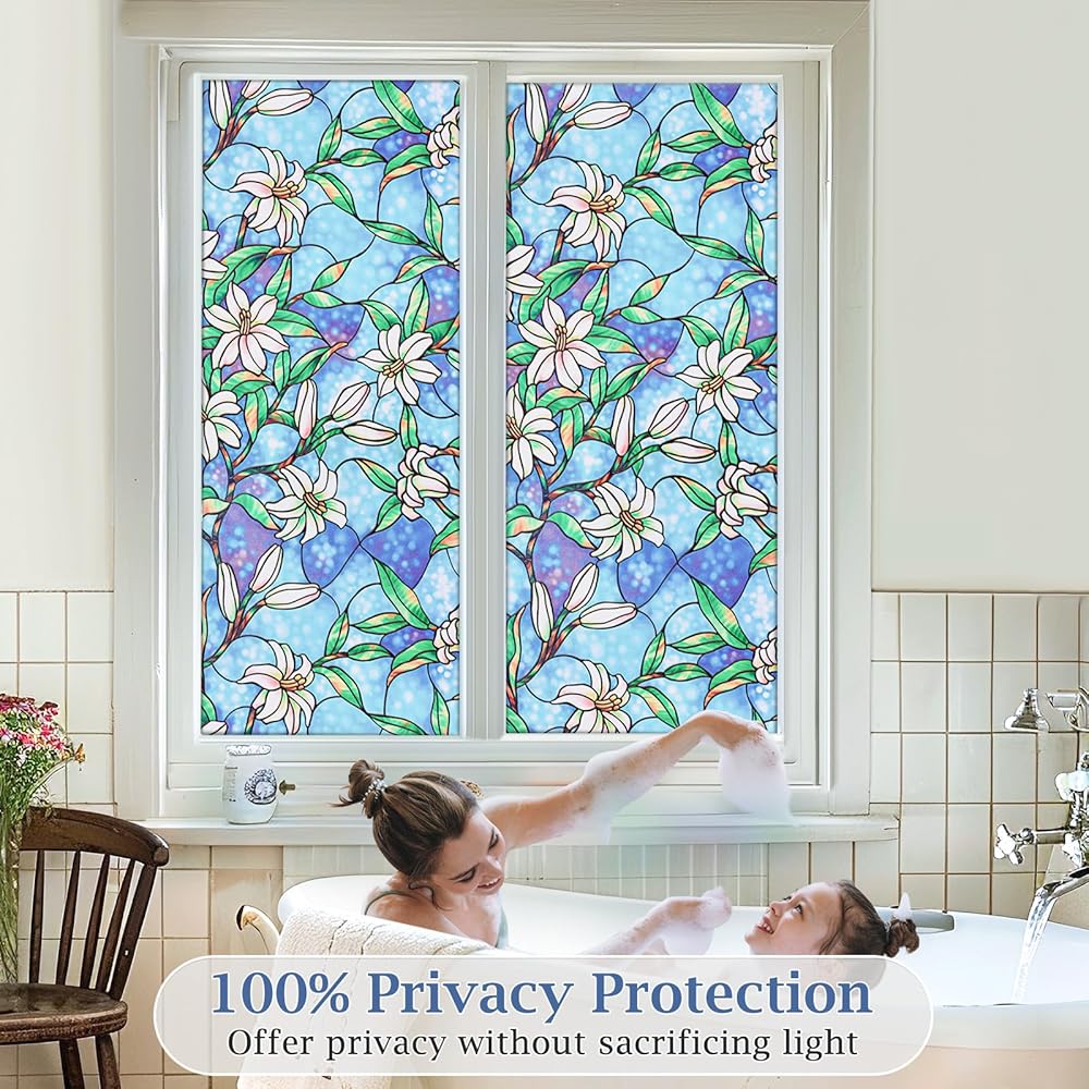 Exclusive Designer Design:Our double-layer printing technique allows elegant lilies to bloom atop a frosted blue backing film, revealing a sophisticated aesthetic. Simply apply it to your window to instantly elevate your room's elegance