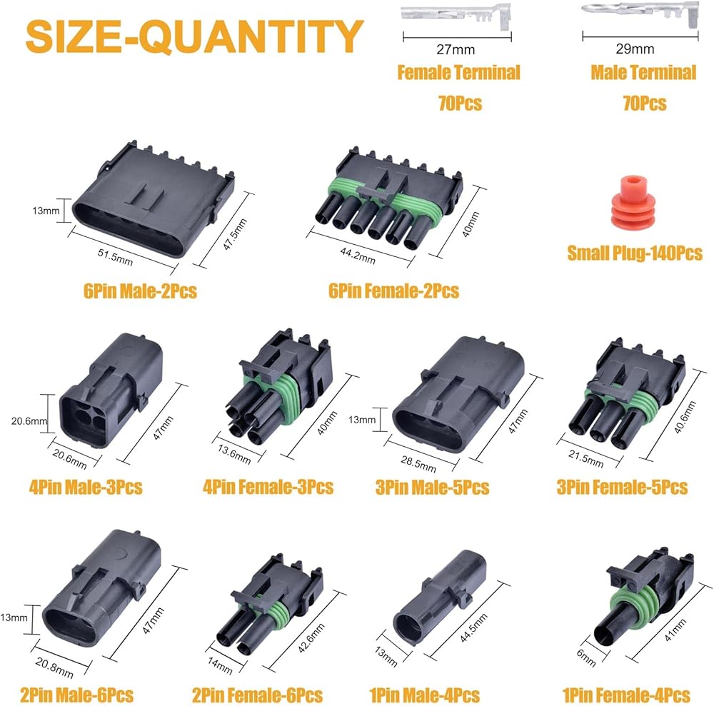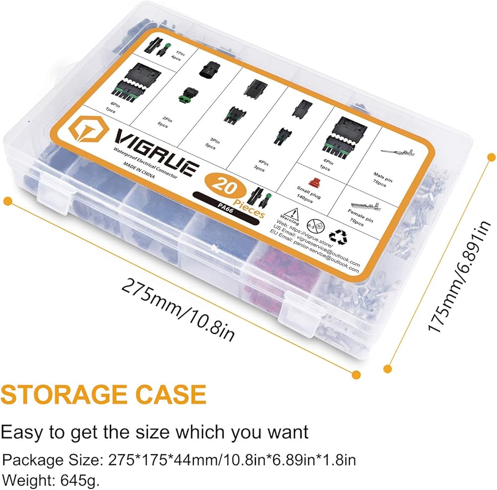 Package Includes: 301Pcs/20Kit 1/2/3/4/6 Pin 18-14AWG automotive sealed waterproof electrical wire connector set with male & female terminal and rubber cable seal