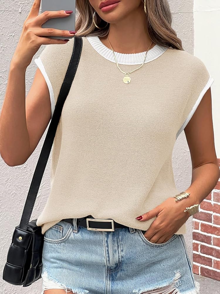 Feature: Cap sleeve tops for women, color block cuff and neck, crewneck, rolled hem, sleeveless sweater top, spring sweater vest, 2025 fashion clothes, lightweight sweater, summer trendy T shirts.
