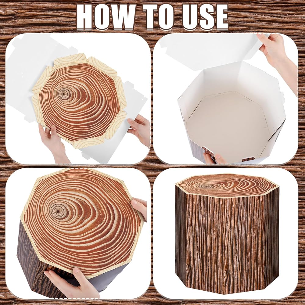 Quality Material and Size for Multifunctional Use: our fake stump boxes decor are made of cardboard, with patterns printed on each side, sturdy, beautifully printed, and not easy to fade; The size of the box after folding is 30 x 30 cm; The large capacity inside allows you to put candies, snacks, balloons and other lightweight party supplies in the box, bringing more surprises to your party