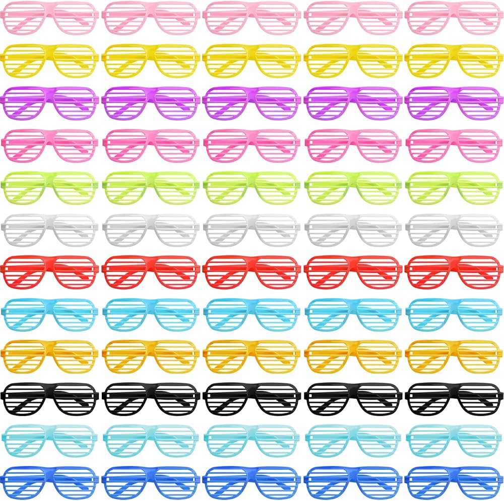 Sunglasses Party Favors: you will get 100 pieces of shutter glasses, including 18 green, 18 red, 16 blue, 16 yellow, 16 pink and 16 purple; Various colors allow you to change them randomly to match different occasions or themed parties