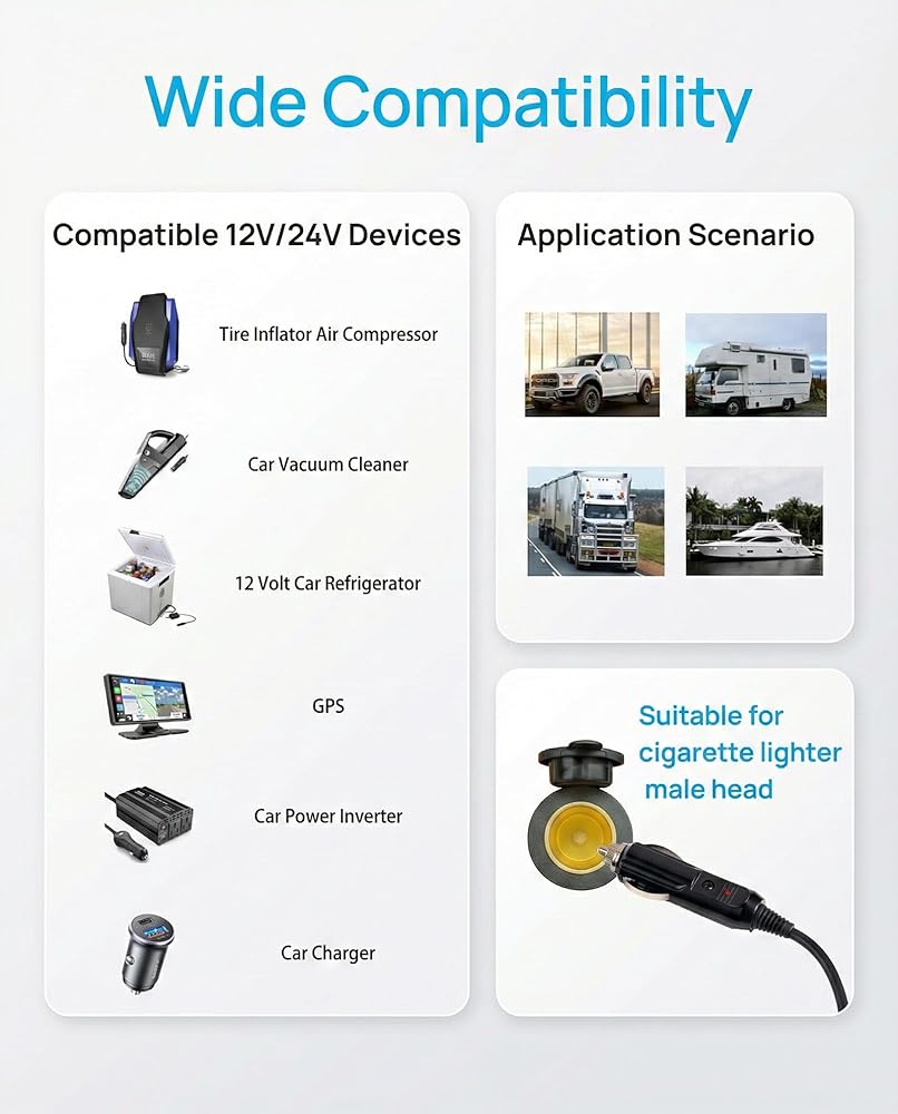 【Heavy duty wire】12v cigarette lighter socket is a dual-core design, cable specification: SPT-2 13AWG/2C (2.5mm²), which can carry more current than a single core. Extension cord length: 3FT(1m).