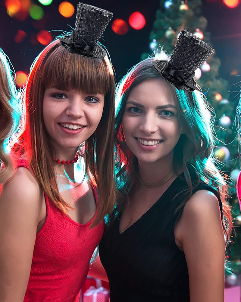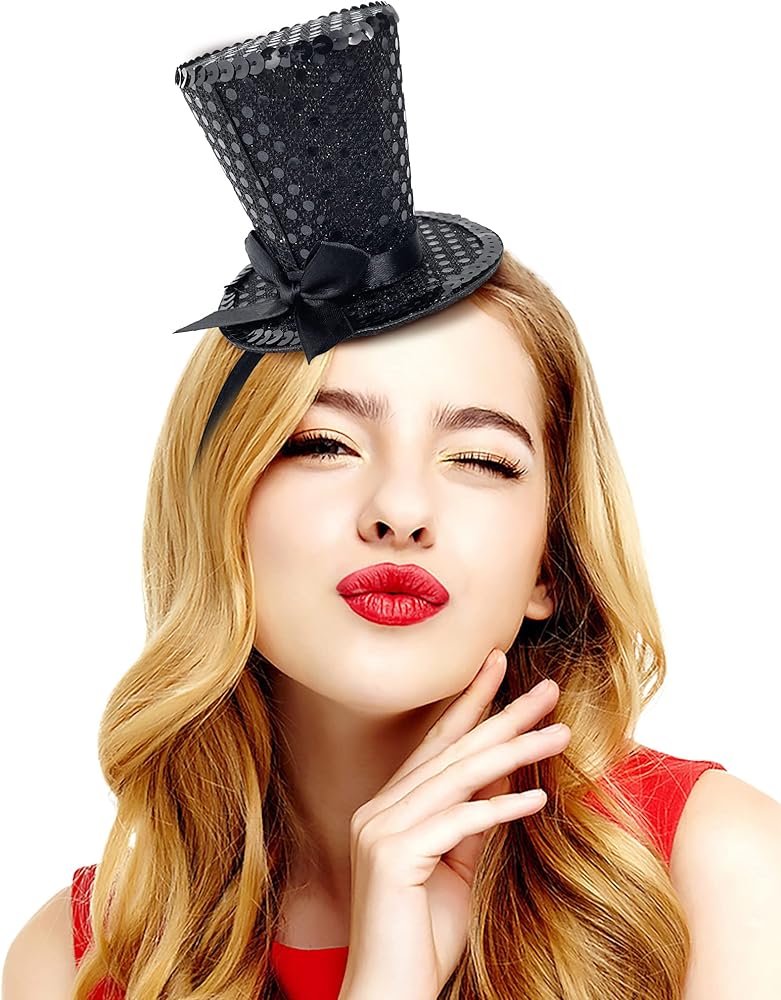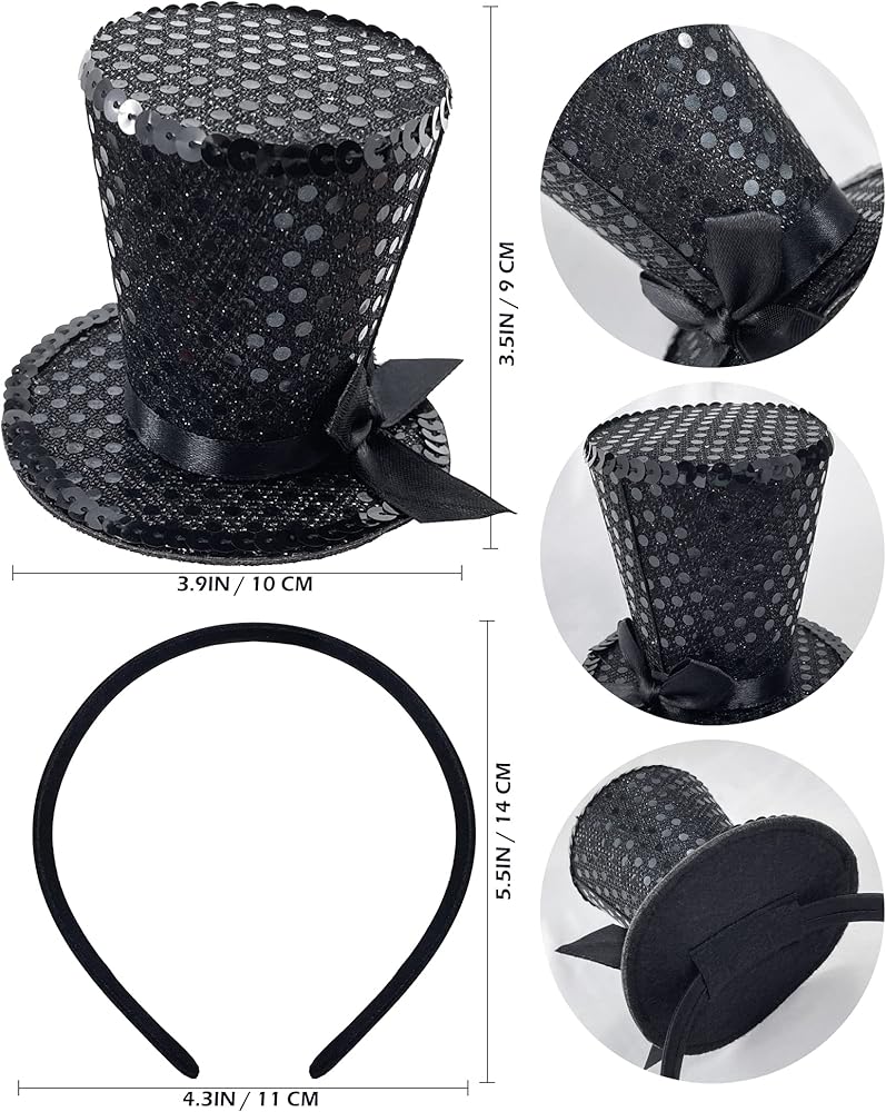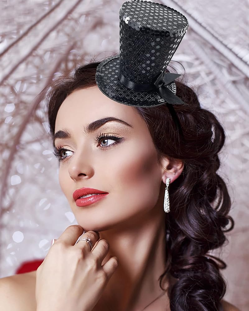 【Sturdy & Comfortable】The sequin mini top hat headband is made out of premium polyester.This party top hat with black band is affordable without sacrificing quality or your comfort. Keep your hair accessory in place with the hidden hair clips and curved brim. Add a mysterious vibe to any costume with the sparkling glitter finish, satin ribbon trim and tulle veil. Add it to your derby Outfit, Victorian Dress,1920s Burlesque costume,Wedding Outfit,and more