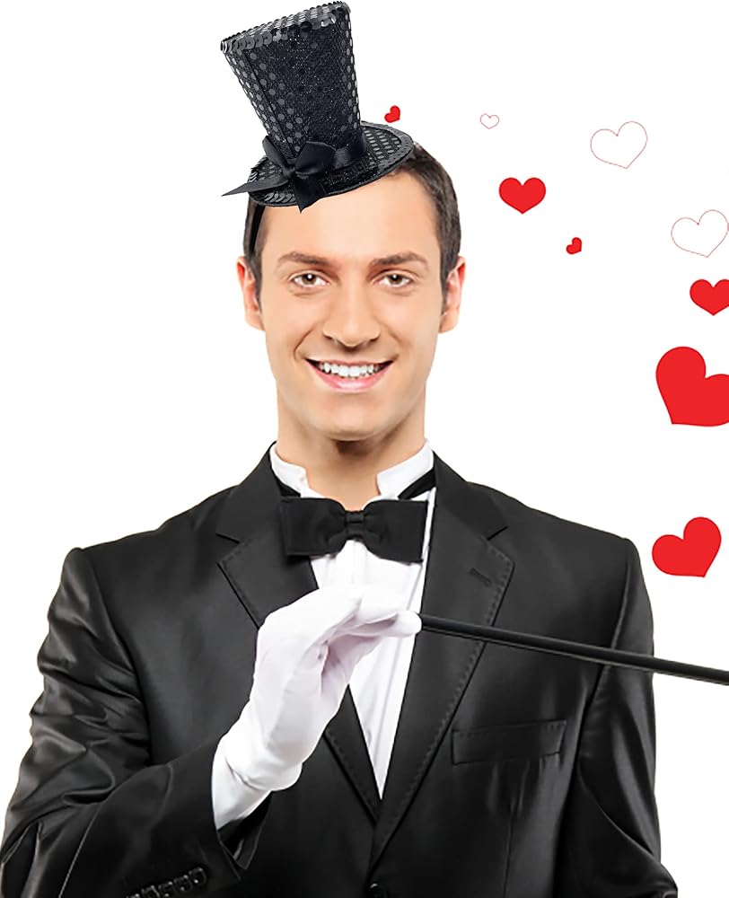 【Mini Glitter Top Hat】Give yourself a dapper look with this stylish mini top hat! It's the perfect accessory for a Roaring 20s party, Victorian wedding, Halloween, or other themed events. Dress up as a circus ringmaster, Dickensian caroler, magician, steampunk gent, mad hatter, and just about anything else you can imagine! This mini top hat costume won't disappoint