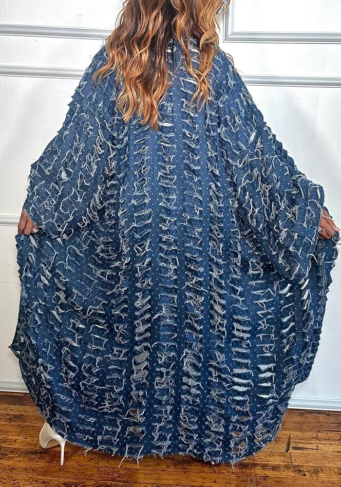 Features: destroyed jeans,cut out,oversized ,floor length,women denim maxi jacket, open front,ripped-out holes, ankle length, long sleeve,straight style, frayed hem, washed distressed design.