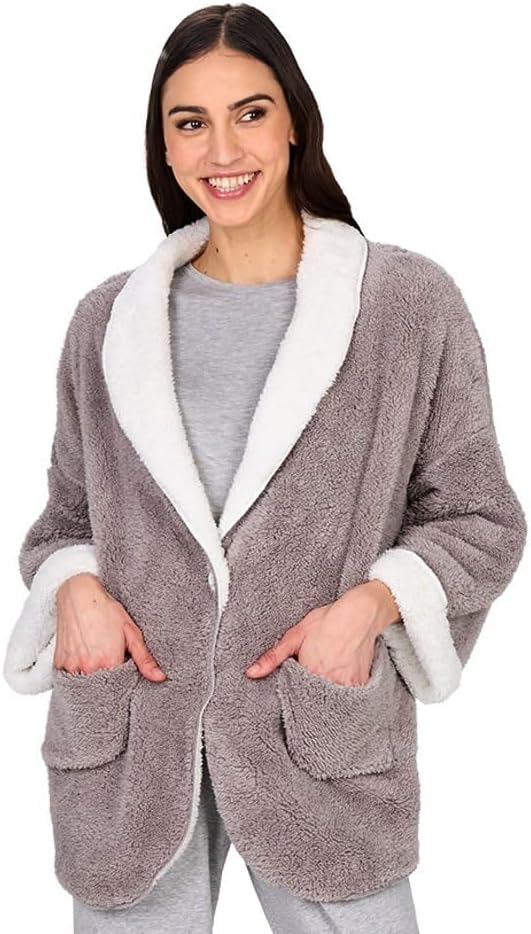 Stay cozy all year round with the Women's Fleece Reversible Jacket, the perfect blend of warmth, style, and versatility. Designed for women who value both comfort and practicality, this waist-length sherpa fleece jacket comes in four beautiful colors: Purple, Pink, Light Blue, and Gray. Each reverses to a crisp white for two looks in one. Whether you're curling up in the house or stepping out to grab the mail, this lightweight jacket offers a roomy cut with ample back coverage to keep you warm and flexible. Featuring large patch pockets on both the inside and outside, you'll always have a convenient spot for your phone, keys, or remote control. Its shawl collar adds a touch of elegance, while the button closures on both sides enhance functionality and make it easy to switch between styles. It's your go-to layer for breezy mornings, chilly evenings, and everything in between. With a wide range of sizes it's designed to provide a comfortable fit for everyone. Whether you're treating yourself or gifting someone special, this reversible fleece jacket is a thoughtful and stylish way to stay snug. Perfect for lounging, quick errands, or even a casual outing, it brings together style and functionality to suit any season. Add one to your wardrobe today and experience the ultimate in cozy versatility! Key Features: STYLISH WOMEN'S JACKETS: Lightweight fleece for snuggling up indoors or out. VERSATILE AND WARM: For snoozing, napping, relaxing around the house when it's chill, or wear outdoors to run errands or walk the dog. TWO LOOKS IN ONE: Comes in Blue, Pink, Purple, and Gray; all of them reverse to white. DETAILS MAKE THE DIFFERENCE: Fuzzy jacket has 2 pockets, long sleeves, and a fashionable, single button closure to give it style and functionality. SIZED FOR EVERYONE: Available in regular and plus sizes Medium, Large, XL, 1X, 2X and 3X. Made of: Polyester Lengths: Falls approx. 6" below waist Care instructions: Machine washable