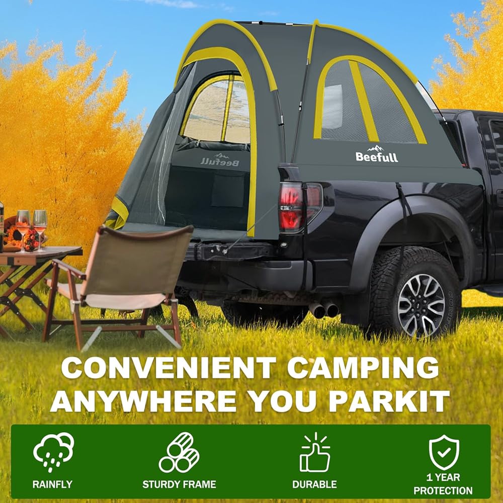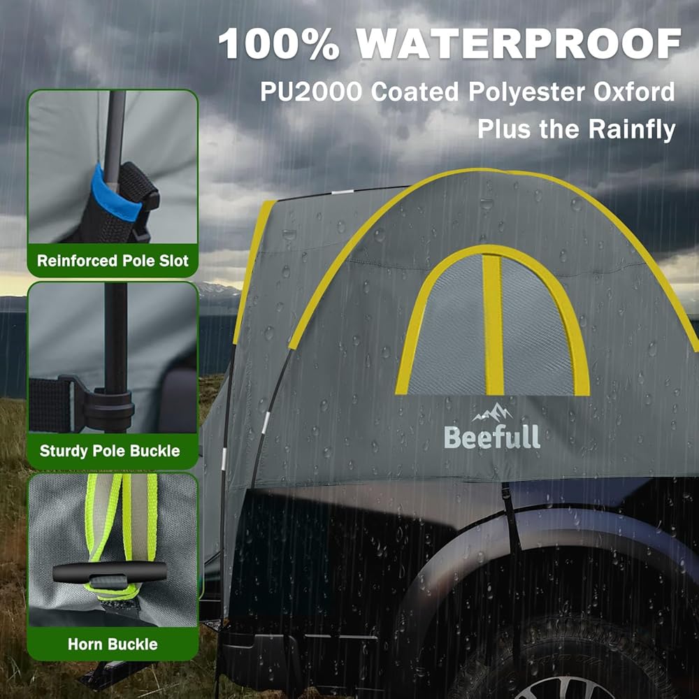 【ENHANCED WATERPROOF PROTECTION】Designed with 210D polyester fabric for outdoor adventures, our SUV tent is built with a PU2000mm coating, ensuring reliable protection against rain and moisture. The taped seams and sturdy zippers further enhance the tent's weatherproof performance, keeping you dry even during heavy downpours.