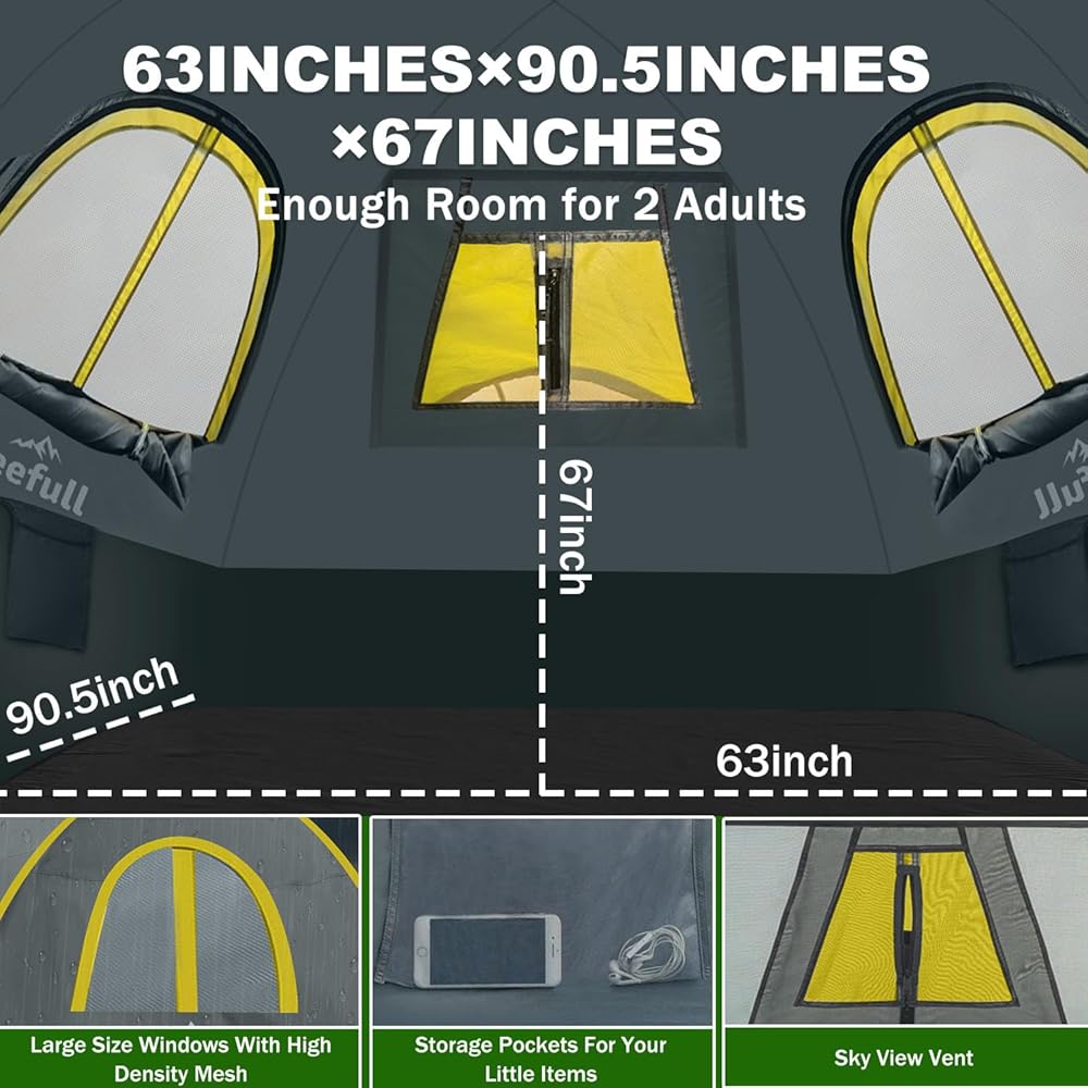 【MAXIMUM VENTILATION AND VIEWS】The tent features large mesh windows and a skylight, allowing for excellent airflow, reducing condensation, and providing stunning views of the surrounding landscape. Enjoy a refreshing breeze and uninterrupted vistas from the comfort of your tent.