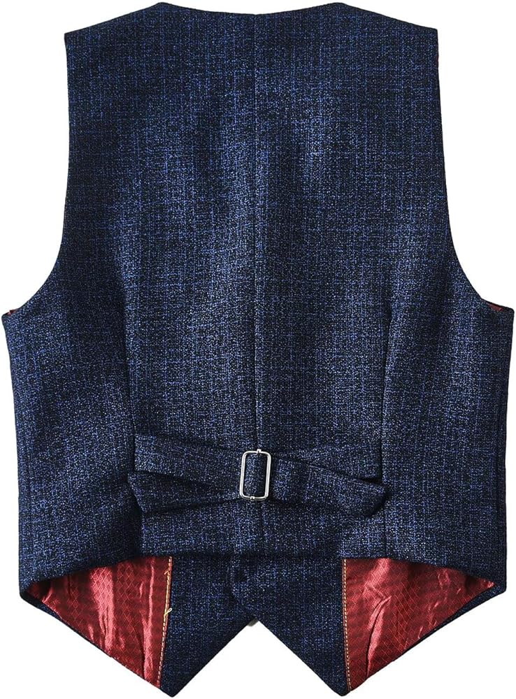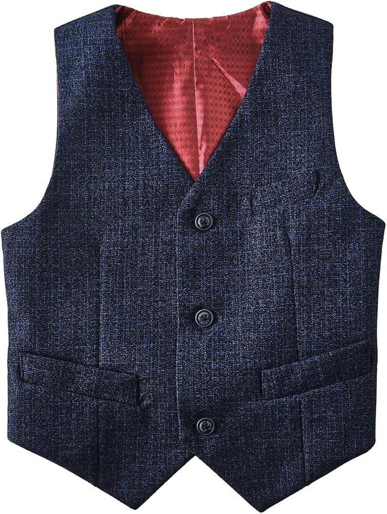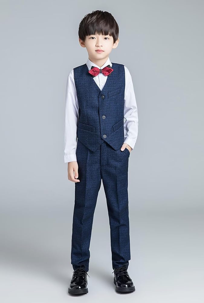 【Design】Boy's Suit, Vest: V-neck, 1 chest pocket, 2 side pockets, adjustable back strap. Pants: zipper closed, with elastic waist. Shirt:Solid color, with cufflinks