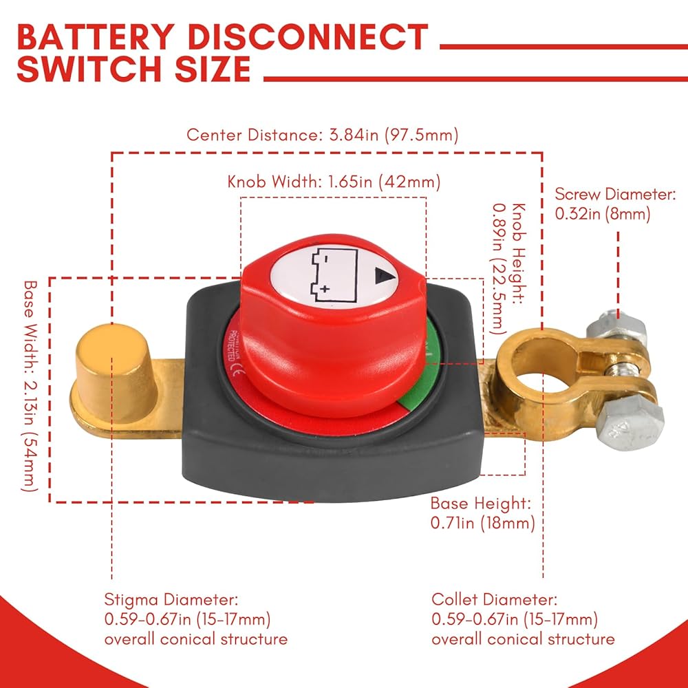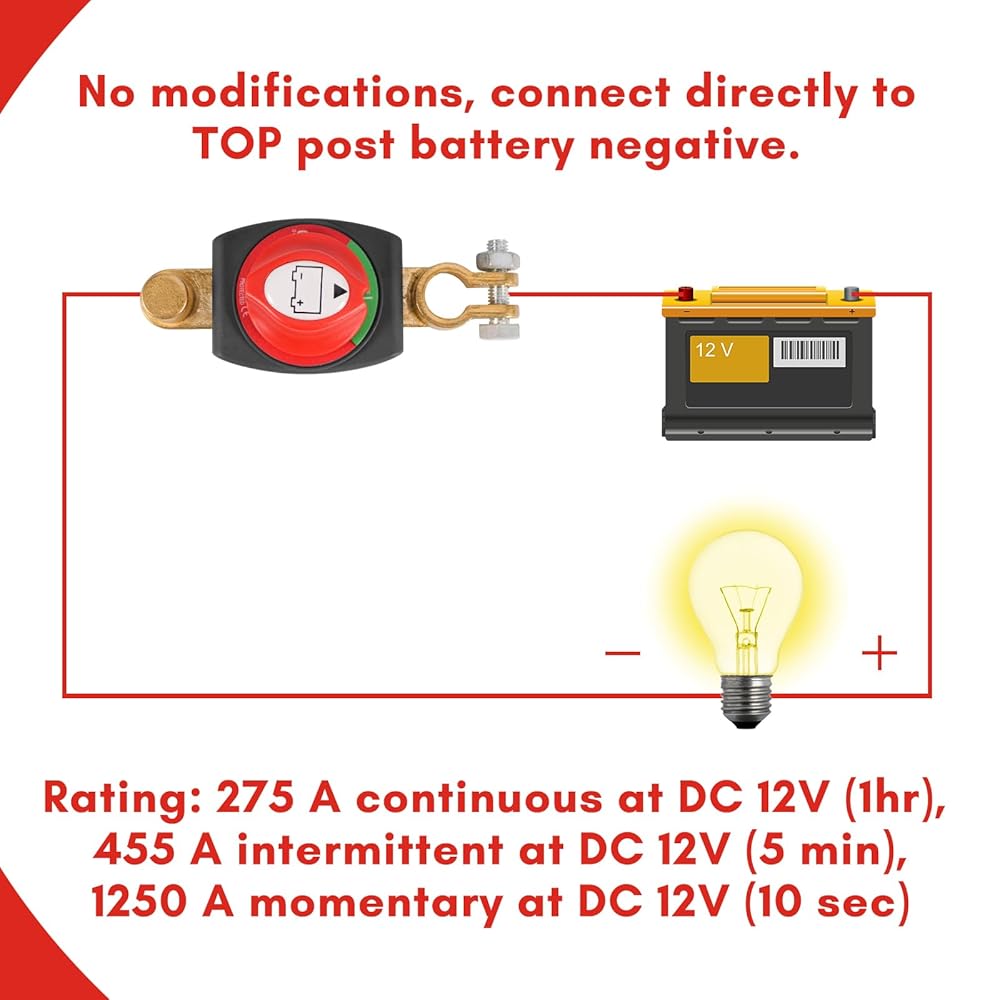 Top Post Car Battery Disconnect Switch, 12-48V Heavy Duty Battery Cut Off Switch for Cars, Boats, RVs, Trucks - Negative On/Off Kill Switch, Easy Install & Durable Design