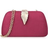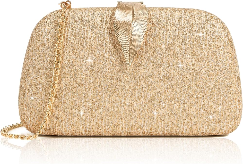 Material:Fashion metallic shape clutch. Our clutch bag is covered with solid and soft suede. Has comfortable touching.Beisides, gold metallic leaves shape closure. That is a vintage design. Interior is made of durable satin. Good for holding stuff.