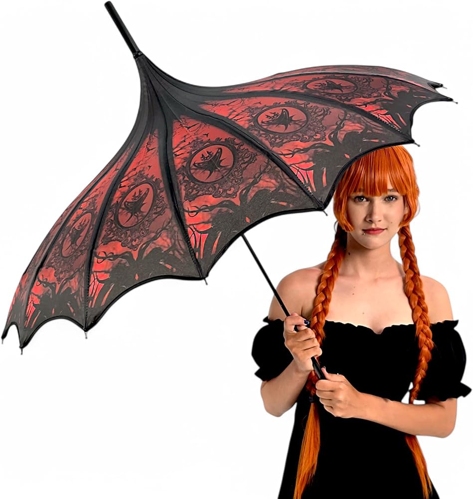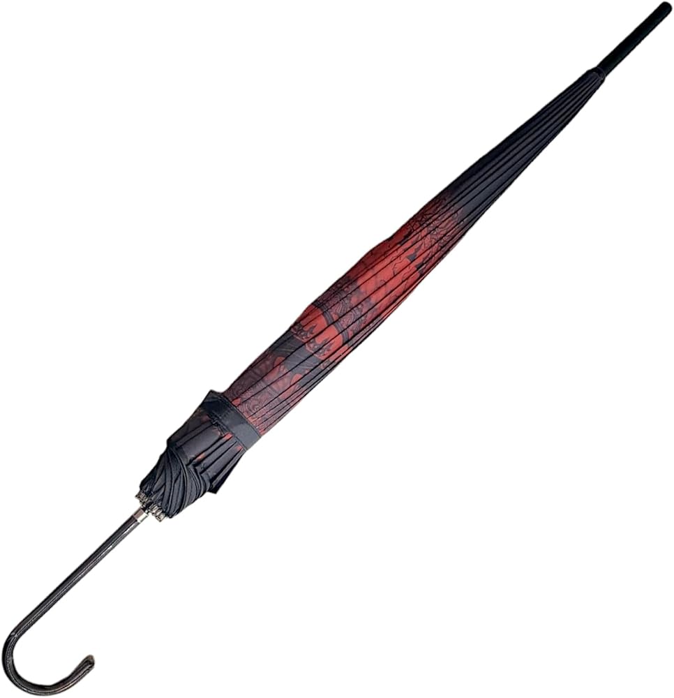 Immerse yourself in the allure of the Red Ritual Dark Wing Pagoda Umbrella. This isn't just an umbrella; it's a statement piece for the discerning gothic and Halloween enthusiast. The haunting color scheme and spooky patterns will turn heads whether you're attending a midnight soirée or simply embracing your dark side on a rainy day. Crafted with meticulous attention to detail, this umbrella features a unique pagoda shape that sets it apart from ordinary rain gear. The bat-wing edges add a touch of macabre elegance, while the custom-designed vampire-inspired red print ensures you'll stand out in a sea of mundane umbrellas. But the Red Ritual isn't just about looks – it's built to perform. With 16 sturdy ribs, this umbrella stands strong against gusty winds, while its waterproof canopy keeps you dry in the heaviest downpours. The new larger handle provides a comfortable grip, perfect for those long walks in the graveyard or late-night urban explorations. Part of our exclusive artisan collection, this umbrella comes complete with a matching carrying case and strap, making it easy to take your piece of darkness wherever you go.