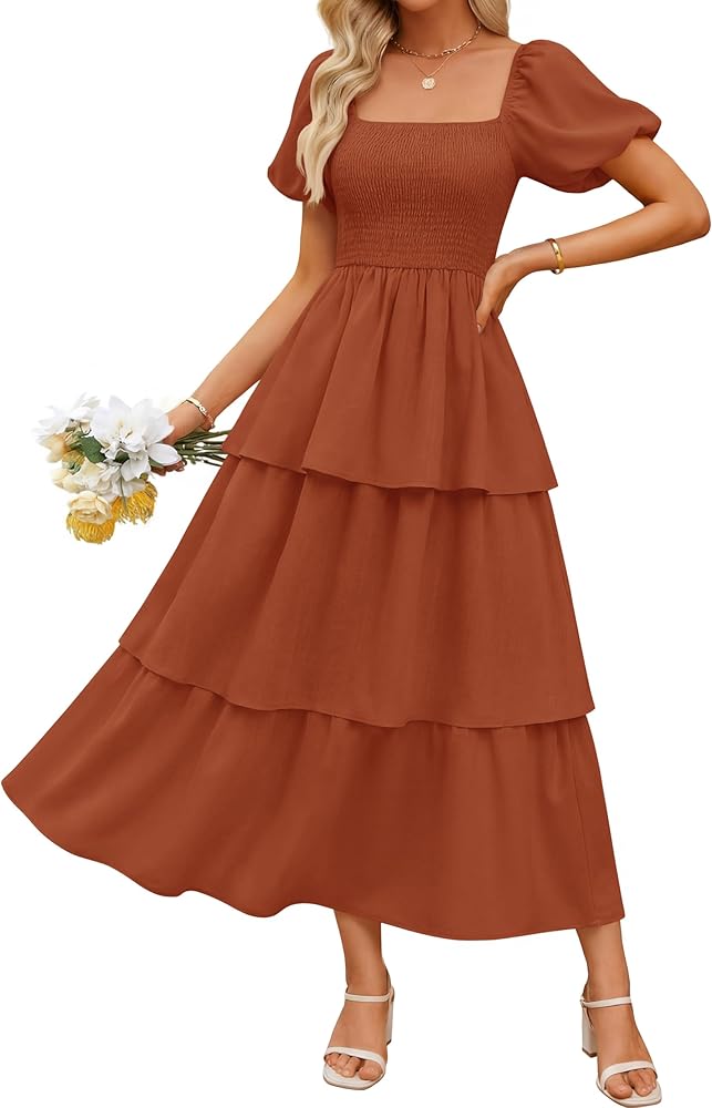 Bohemian beach dress features short puff sleeves, square neck, backless, smocked bodice, lace up back, elastic high waist, ruffled tiered skirt with lining, swing a line style, midi length, no pocket, cute babydoll dress
