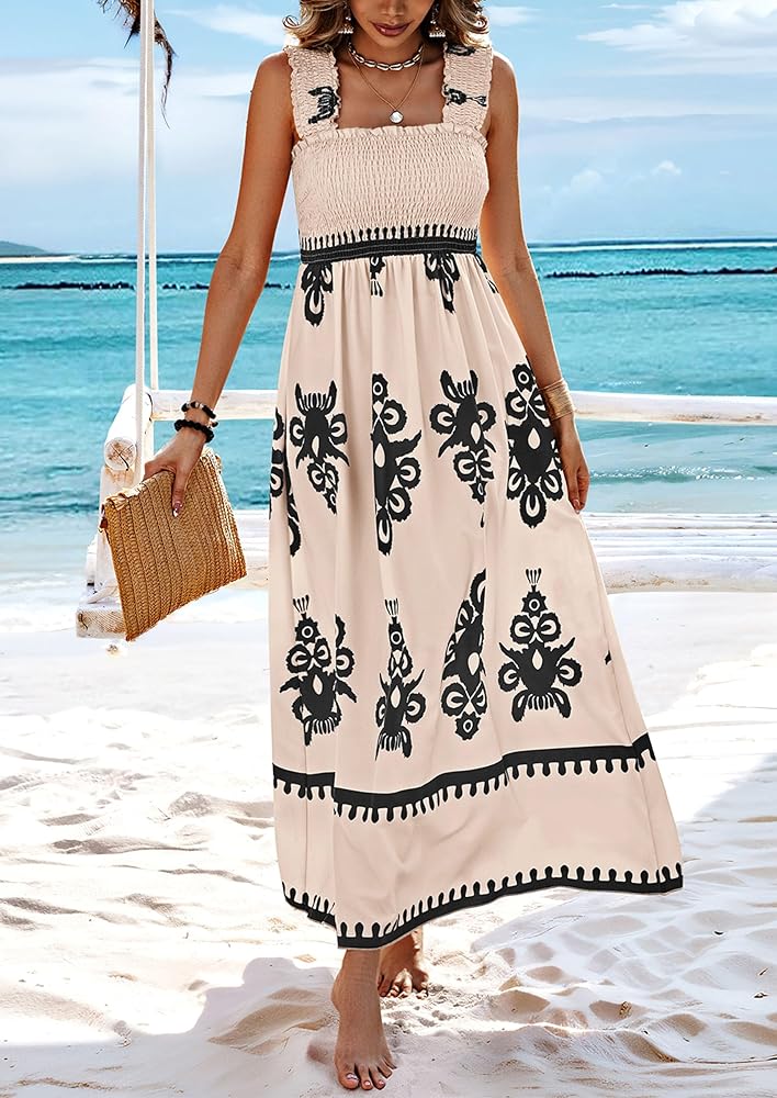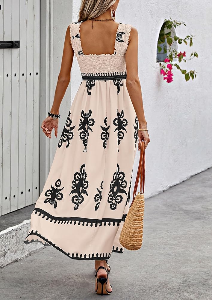 DESIGN FEATURES: Sleeveless Maxi Dress for Women/Floral Dress for Women/Flowy Dresses for Women/Boho Dress for Women/Womens Summer Dresses/Tiered Square Neck Dress for Women/A Line Dresses for Women/Beach Dresses for Women/Smocked Dress Women