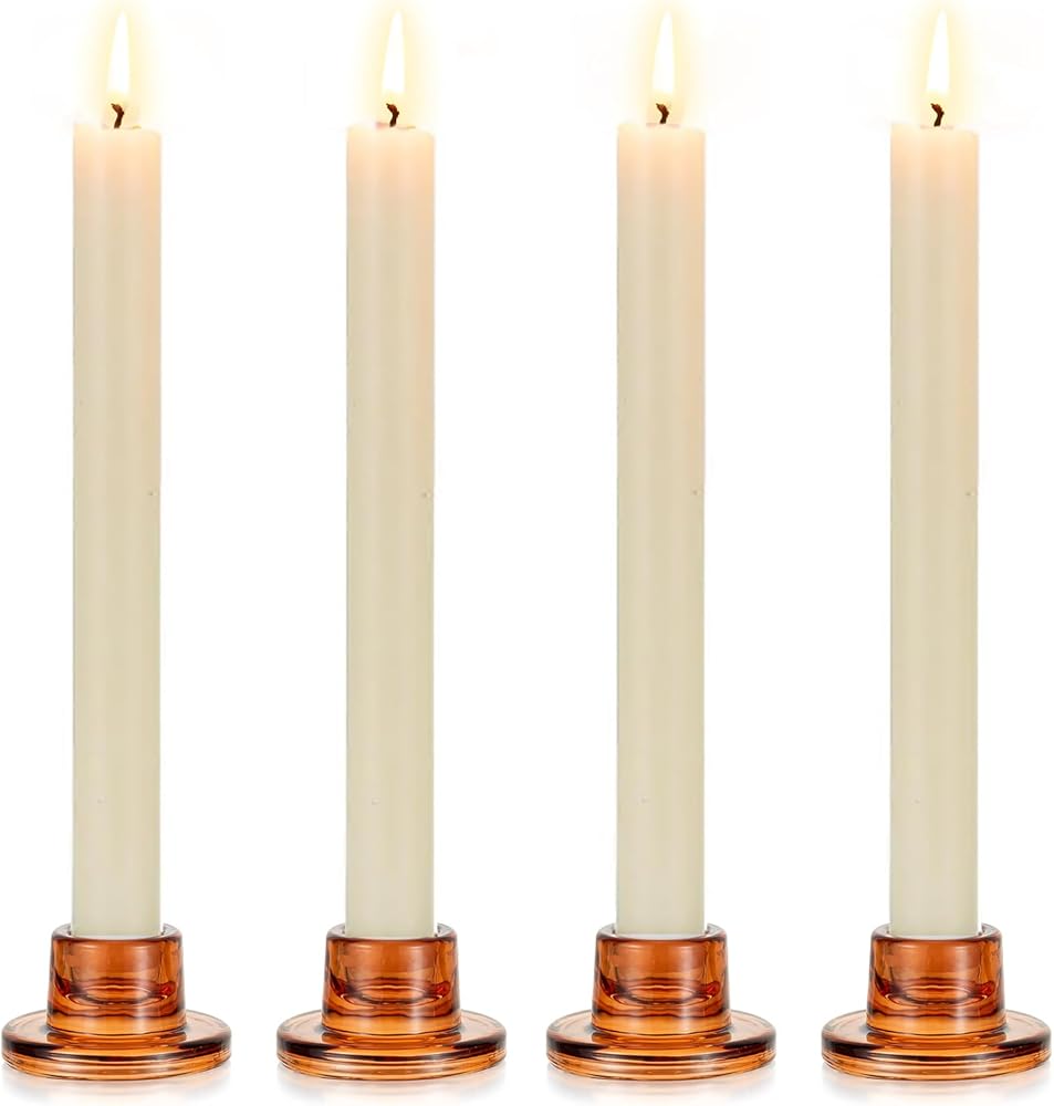 Well Made Glass Candle Holder: Made of thick glass, this candlestick holder has a minimalist appearance, they have a thin weight and a wide base to prevent accidental tipping. The smooth glass texture presents fine workmanship. With a 0.9'' candle socket, the taper candle can sit properly in them, durable all year round