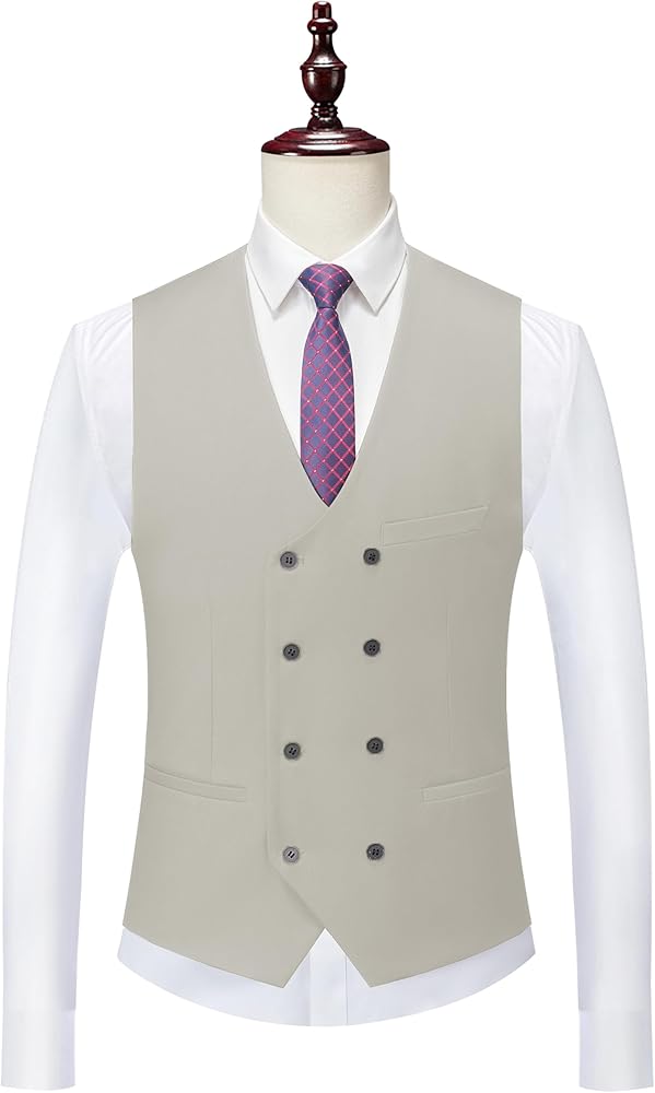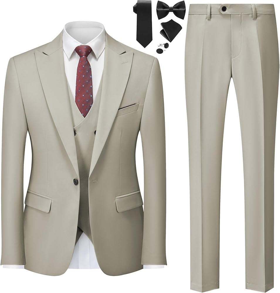 Package include 1*blazer + 1*trousers + 1*vest + 1*tie set, The slim-fit suit jacket has two side pocket and two functional breast pockets, one exterior, and one interior. With a fashion peak lapel, single-breasted buttoning, one button closure and a center vent. the expandable waist pants make it felt comfortable,double breasted waistcoat.