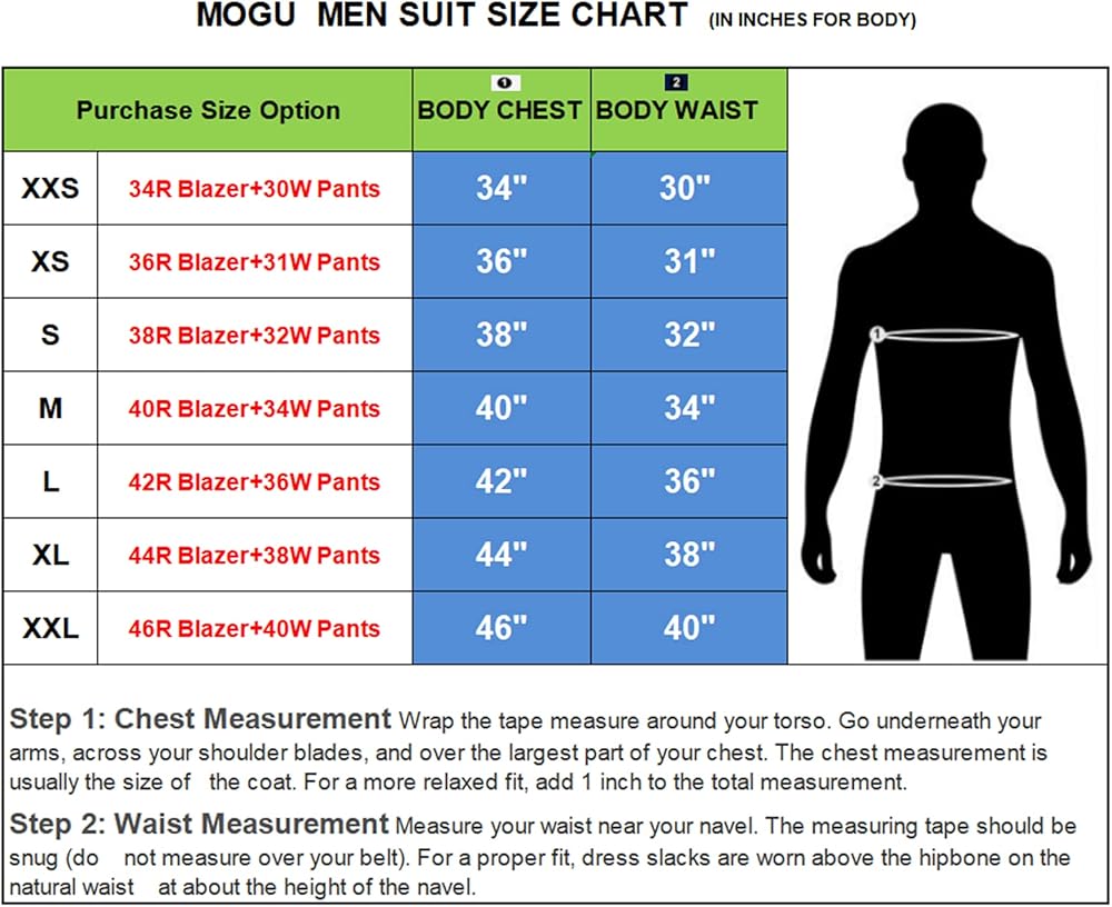 Purchase this three piece suit will receive a high quality random neck tie. XXS≈(34R blazer+30W pants),XS≈(36R blazer+31W pants), S≈(38R blazer+32W pants), M≈(40R blazer+34W pants), L≈(42R blazer+36W pants), XL≈(44R blazer+38W pants), XXL≈(46R blazer+40W pants).