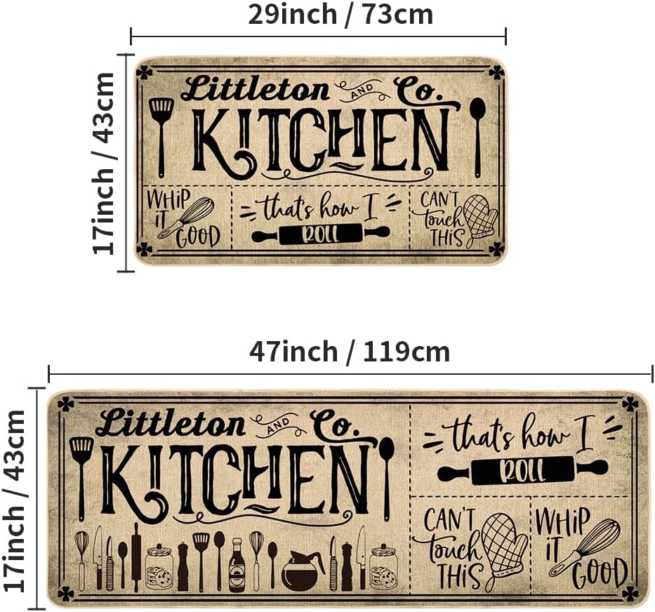 Washable Non Slip Kitchen Rugs and Mats Set of 2, Rustic Style Decorative Rubber Backing Absorbent Kitchen Mats for Floor Front of Sink - 17x29 and 17x47 Inch DM194