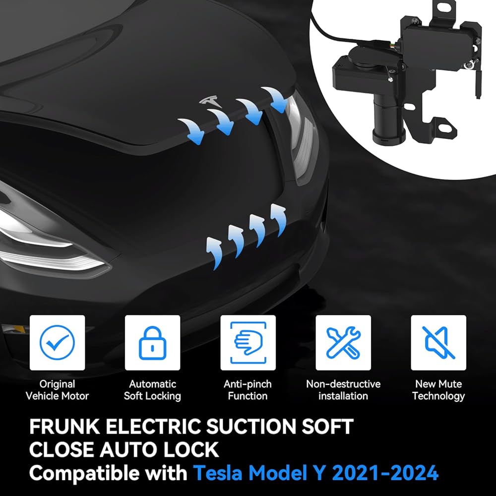 Damage-Free Installation : Tesla trunk soft closing lock is plug and play, no wire cutting, no drilling, just cover the original suction lock. When the frunk closes with a 5mm gap from the front of the car, it locks automatically.